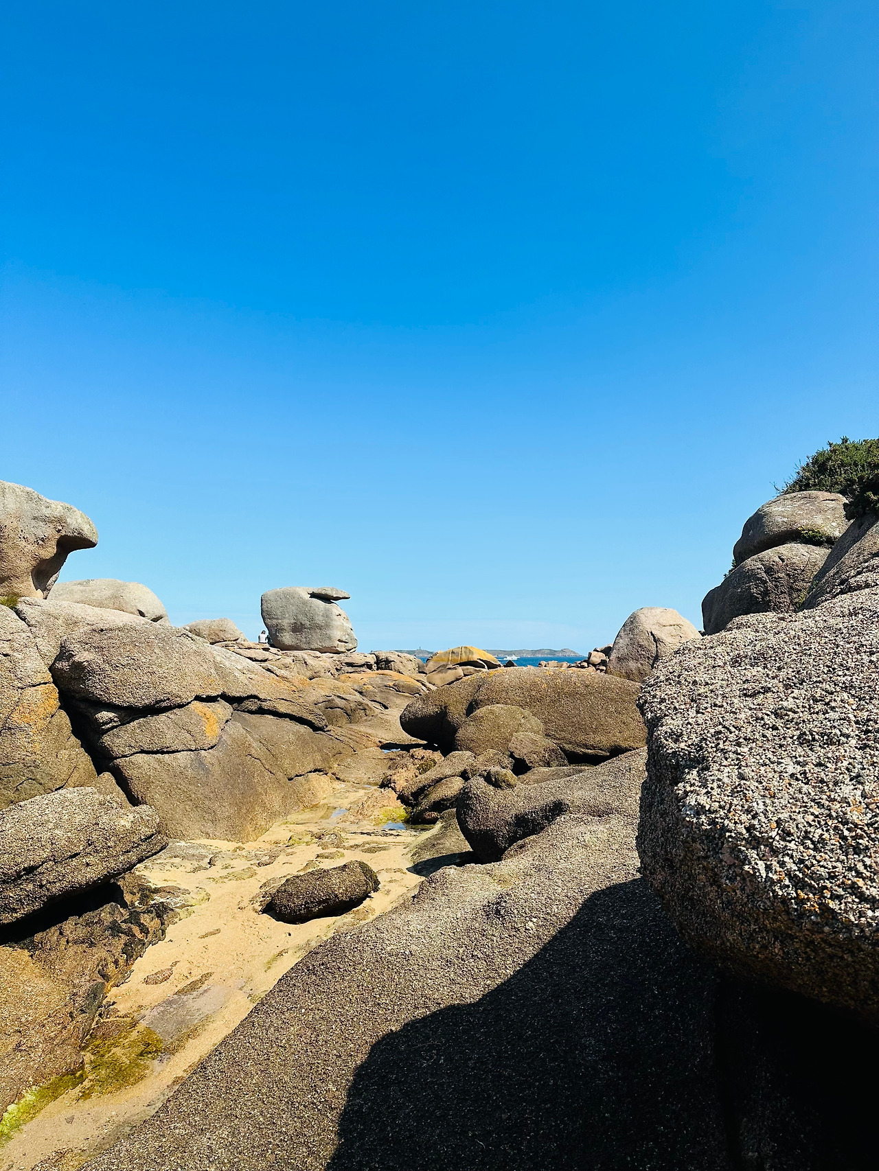 경사진 화강암 지대로 걸음을 옮기자 낮게 뜬 구름 아래로 정박한 작은 배와, 배의 반영이 한 조각의 사진처럼 나타났다. 살랑이듯 일어난 바람이 잔물결을 일으키며 햇볕과 함께 리듬을 탔다. 햇빛이 바다 위를 반짝이며 최면을 거는 듯해, 바다를 넋 놓고 보게 했다. 해안가에 툭툭 놓아진 화강암도 자연 조형물 그대로 예술 작품이 되었다.