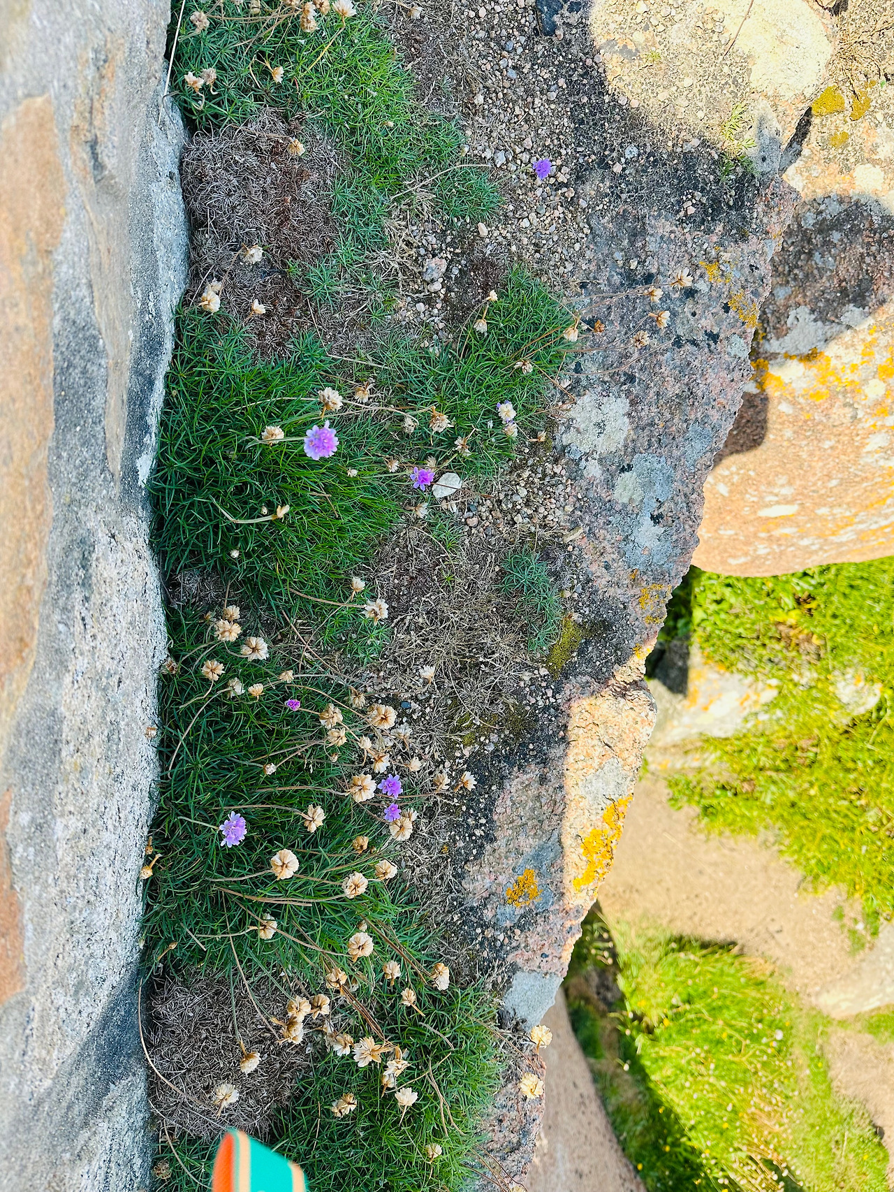 듬성듬성 놓인 바위 작품들을 지나며, 등대에 가까워졌다. 정상 부근에 이르자 편평한 초록 들판이 펼쳐졌다. 들판에는 해안가에 서식하는 키 작은 식물들과 분홍빛 에리카(Erica cinerea)가 진초록색에 묻혀 자라있다. 하늘거리는 흰색의 레이스 플라워, 아미초(Ammi maju)도 바람에 선들거린다. 분홍빛이 바래가는 아르메리아 (Armeria maritima)는 낮은 덩이처럼 퍼져 자라 있다. 때마침 시원한 바람이 이마와 목덜미를 쓸면서, 송골송골 맺혀 있던 땀방울을 상쾌하게 훑고 지나갔다. 정상에 오른 보람으로 미소가 절로 번졌다.