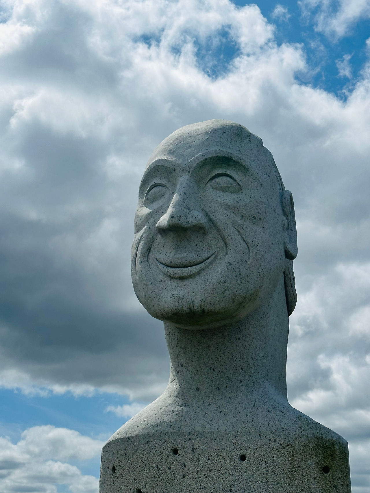 전장의 부츠 같은 신을 신고 거대 강아지와 먼 곳을 바라보는 성인, 모자를 쓰고 팔레트 위에서 붓으로 색을 섞고 있는 화가 성인, 거대 성인의 측면에 붙은 아기 성인, 늑대인간이 끄는 마차에 탄 동물들 등, 석상은 신화와 결합한 상상력의 열매가 관람객들을 깊은 사색으로 이끌었다. 그때, 해맑게 웃는 하회탈을 닮은 거대한 얼굴 석상 위로 구름 사이 햇살이 사선으로 비쳤다. 신의 계시처럼 성스러운 분위기가 감돌았다. 볕 때문이었을까? 석상의 웃고 있는 입가 주름이 더욱 인자하게 느껴졌다.