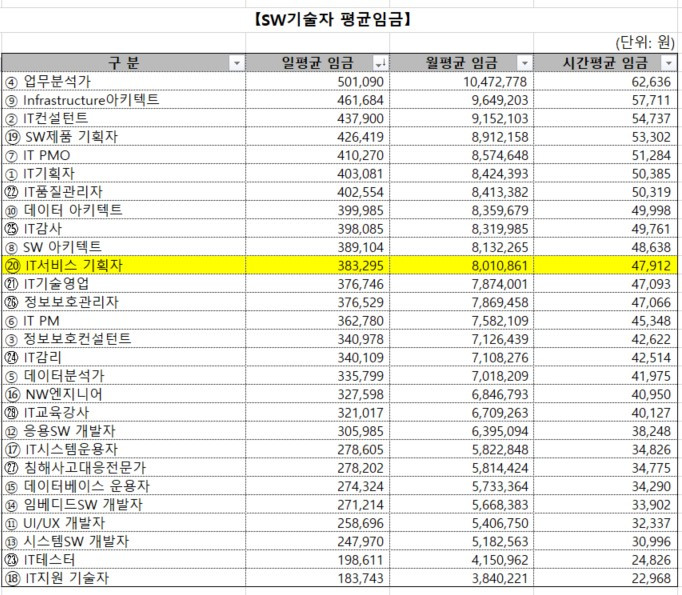 SW(소프트웨어) 기술자 평균임금 공표 자료로 본 IT서비스 기획자 직무
