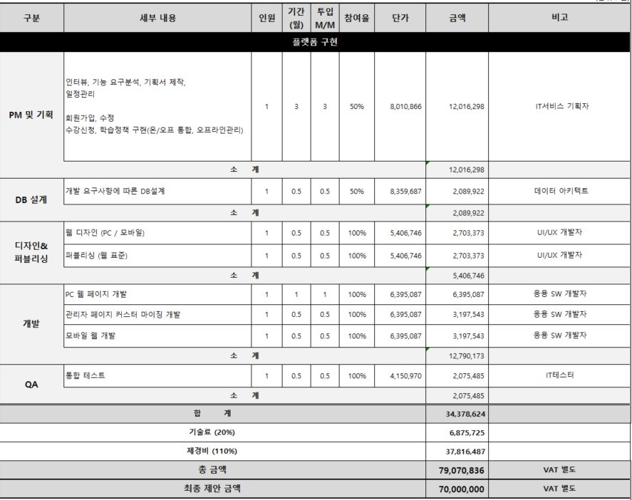 IT서비스 기획 (기획) / 데이터 아키텍처 (설계) / UI/UX 개발 (디자인, 퍼블) / 응용 SW 개발 (개발) / IT 품질관리 (QA)로 진행됩니다.