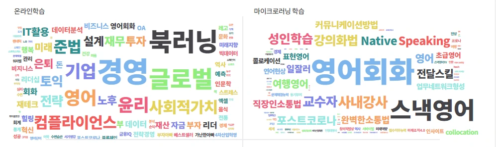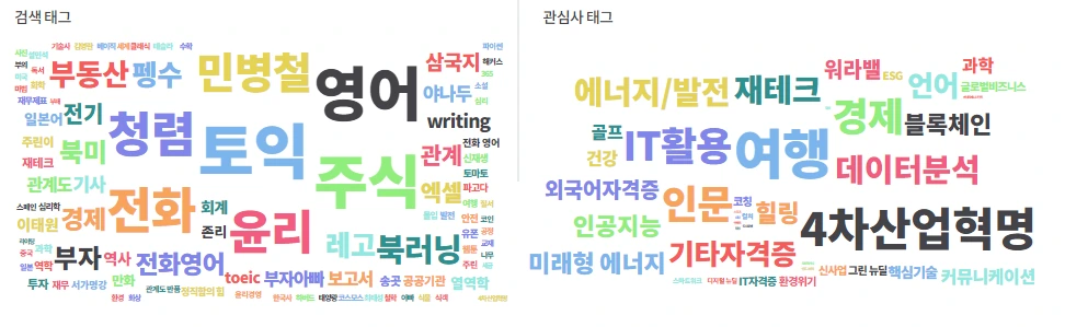 직원들이 학습한 콘텐츠에서 태그를 끌어내는 방법도 있지만, 학습자들이 직접 검색하는 단어들을 통해서도 확인할 수 있고, 관심사로 지정한 키워드들로 빈도를 확인하는 방법도 있습니다.