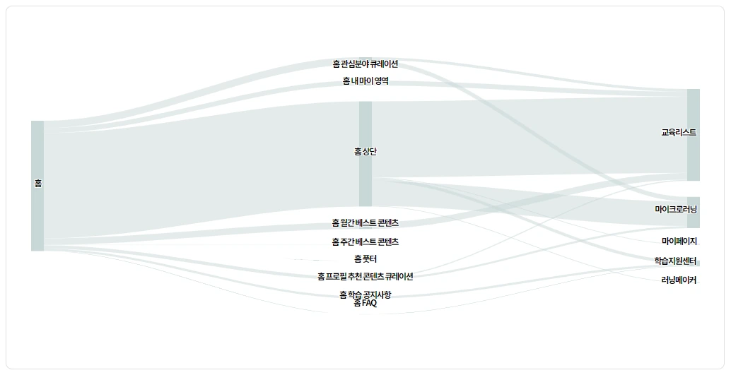 더불어서, 계속 학습자들에게 더 매력적이고 효과높은 콘텐츠를 제공하기 위해서는 가장 많은 클릭을 보이는 메인페이지의 흐름을 분석할 필요가 있는데요. 넷플릭스처럼 메인 페이지에 다양한 분류로 콘텐츠를 제공하고 있다면, 당연히 얼마나 클릭이 있고, 다른 것으로 변경했을 때 어떤 변화를 보이고, AB 테스트 같은 활동 수행 결과도 확인하려면 아래와 같은 지표들을 계속 들여다보는 것이 좋습니다.