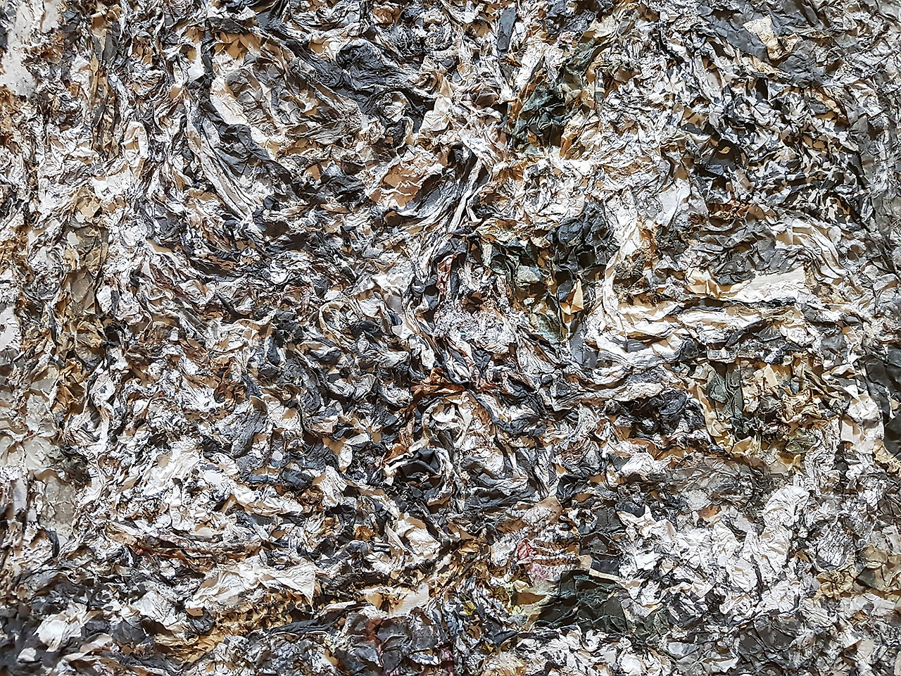전시관에 들어서며 낯설지 않은 나무의 소리를 벗 삼아 첫 번째 작품과 마주한다. 고향땅의 흙 질감이 살아있는, 원경과 근경을 동시에 표현하고 있는 듯한 모습이다. 어찌 보면 고향땅의 흙바닥을 매우 가까이서 바라본 모양이고 또 어찌 보면 비행 중 적당한 고도에서 내려다본 굽이치는 산과 강과 땅의 모습이다. 콜라주로 표현된 선생의 작품은 다소 거친 질감과 색의 조화로 신비한 효과를 만들어내고 있다. 작품이 완성되던 시기 선생은 독일을 거쳐 파리의 땅을 밟고 있었는데, 궁핍한 생활로 아침마다 작품의 재료가 되는 버려진 신문과 잡지를 줍는 것이 일과 중 하나였다. 이 작품은 그 어려움 속에서도 생경한 재료를 통해 떠나온 고향땅을 그리고 있다는 느낌을 갖게 한다.