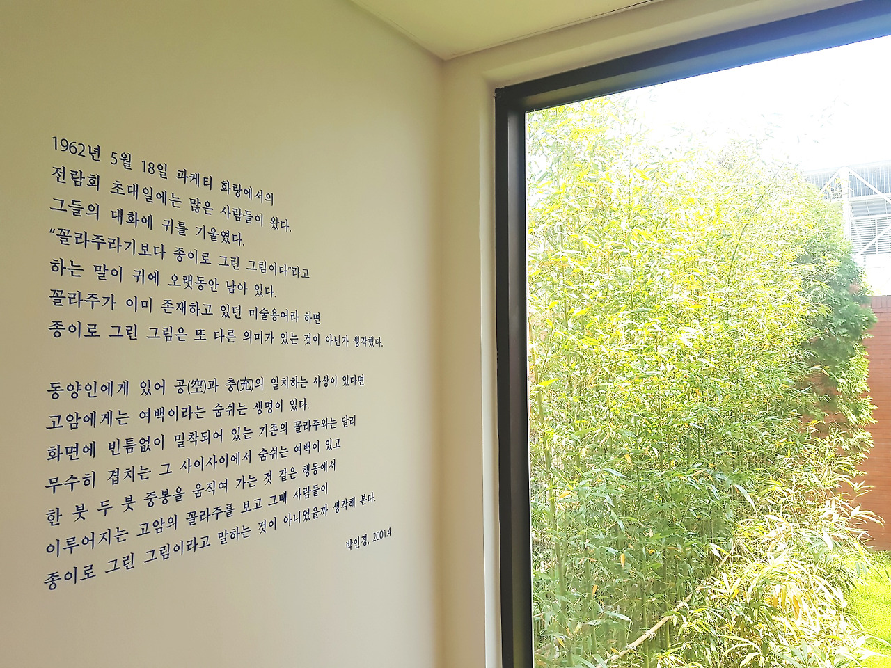 이번 전시에서는 마지막 공간에서 처음 공간으로 돌아가 다시 마지막으로 빠르게 훑어 돌아오는, 일종의 전시를 마무리를 짓는 의식과도 같은 행동을 하지 않았다. 대신 전시관 출구로 향하는 마지막 길을 걸으며 지나온 공간을 뒤돌아 본다. <이응노, 종이로 그린 그림> 속 작품과 공간, 그 모든 것들은 분리된 듯 너무나 유기적이었다. 지나쳐온 작품들은 '두고 왔다'는 생각보다 '거쳐왔다'는 느낌을 받게 했고 처음부터 끝까지 눈과 마음에 담았던 작품과 공간들이 함께한다. 고립된 느낌 없이 자유롭지만 안정된 관람을 마무리하며 고암의 부인 박인경 여사의 말을 마지막으로 천천히 음미하며 작품과의 산책을 마무리한다.