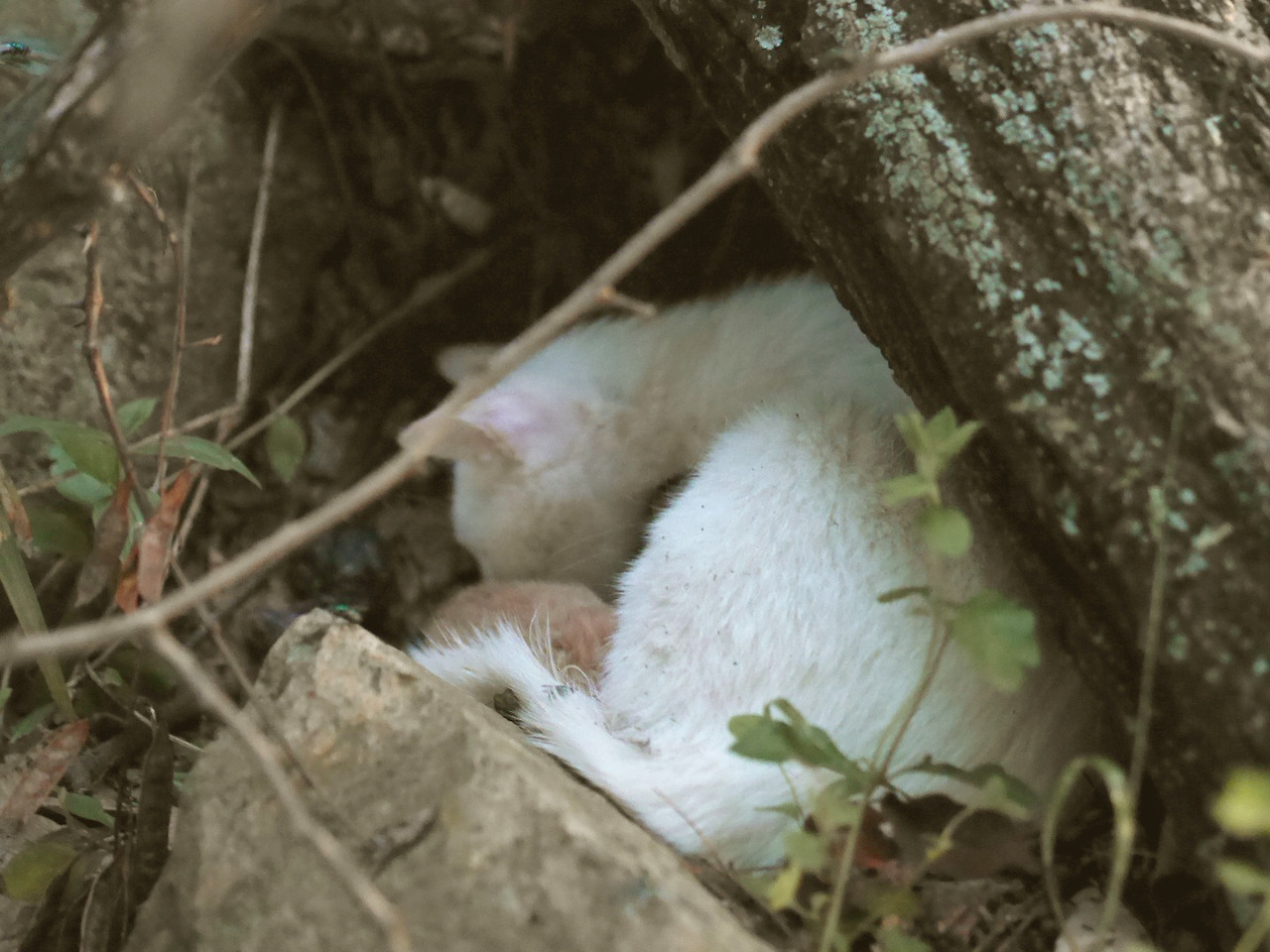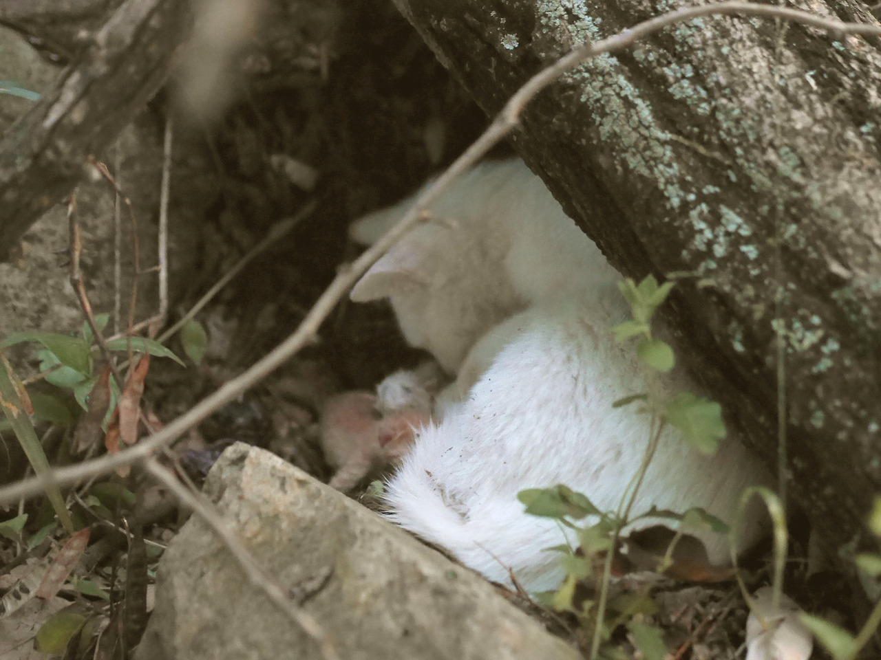 마리는 평소보다 매우 수척하고 늘어져 보였다. 그런 그녀를 더 가까이서 보려고 다가가자 지금까지 한 번도 보지 못했던 그녀의 반응과 마주했다. 그녀는 나를 향해 하악질을 해댔다. 마리는 뭔가 분위기가 달라져 있었다. 내가 마리와 잠시 대치하는 동안 또 아기들의 울음소리가 들려왔다. 나는 소리를 따라 다시 추적에 나섰다. 마리에게서 얼마 떨어지지 않은 곳, 관목 덤불 아래였다. 하얗고 꼬물거리는 무언가가 얼굴을 내밀고 울고 있었다. 아직 눈도 뜨지 못한 채. 나는 곧바로 마리를 바라보았다.