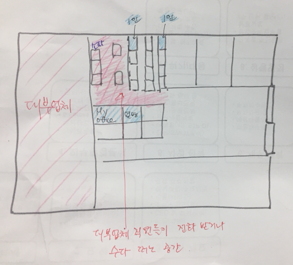 이 글을 혹여나 읽게 될 독자의 이해를 돕기 위해 정말 못 그리는 그림임에도 불구하고 과감하게 첨부한다. 나와 내 앞 쪽 공간의 두 1인 창업자 이렇게 세 사람은 매일 이들과 함께 무드를 공유한다.