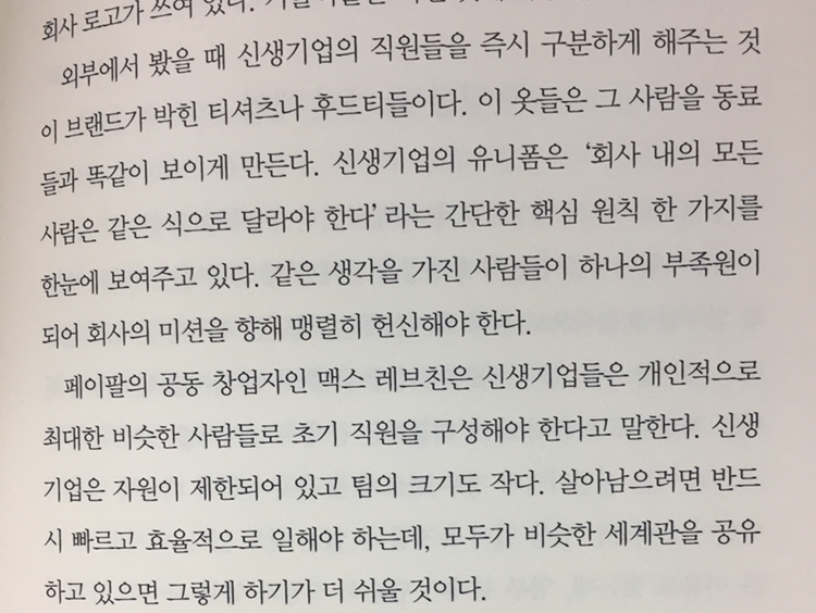 신생기업들은 개인적으로 최대한 비슷한 사람들로 초기 직원을 구성해야 한다고 말한다. 살아남으려면 반드시 빠르고 효율적으로 일해야 하는데, 모두가 비슷한 세계관을 공유하고 있으면 그렇게 하기가 더 쉬울 것이다...