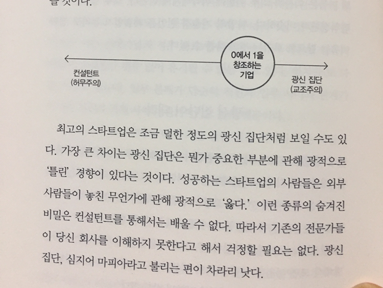 광신집단처럼 뭔가에 미쳐야만 성공할 수 있다는 말에 공감하게 된다. 0에서 1을 창조하는 기업은 차라리 마피아 조직같아야 한단다.