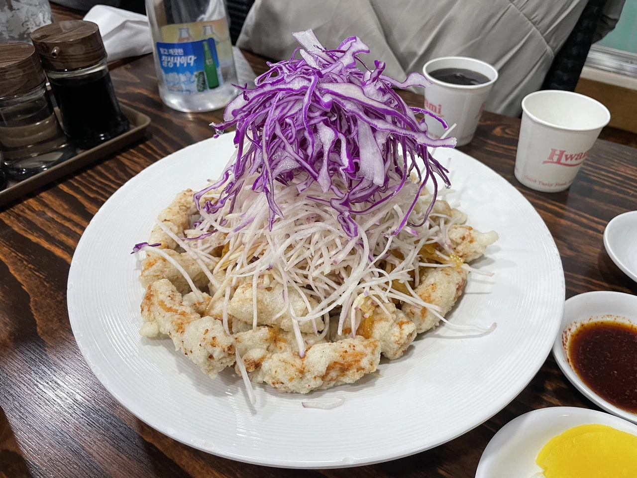 금문도의 탕수육은 그것이 태어난 고향을 다시금 상기시키듯 강화도 특산품인 순무가 푸짐하게 쌓여있다. 탕수육이라는 음식이 이렇게 외관만으로도 압도감을 주는 음식이라는 것을 나는 처음 느꼈다. 탕수육과 무채의 조합이라니 참으로 기이하면서도 신선한 외경이다. 탕수육 아래에는 간장과 식초, 유자청으로 버무려진 달콤, 새콤, 짭조름한 소스가 있다. 이 소스를 무채와 함께 버무리고, 탕수육 위에 양념을 가득 머금은 무채를 올려 입안으로 넣는 순간 짭조름하면서 달콤한 유자간장소스가 혀 중단과 말단을 자극하고 향긋한 유자소스가 콧노래를 준비하기 시작한다. 윗턱과 아래턱 사이에 들어온 탕수육과 무채는 따뜻함과 차가움, 쫀득함과 아삭함을 번갈아주면서 아까부터 준비한 콧노래를 드디어 연주하게끔 한다. 참 맛있는 탕수육이다.