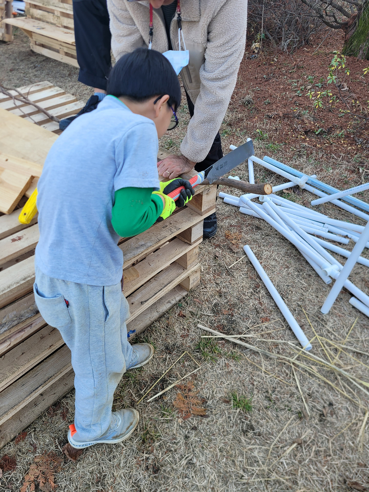 오랜 기간 모험놀이를 진행하며 아이들을 만나온 선생님들은 적당한 거리에서 아이들을 지켜봐 주고 도움이 필요할 때 뿅 하고 도와주셨다. 너무 위험할 경우 아이들과 짧은 대화를 나누며 의견을 나누었다. 아이의 놀이에 어느 정도 개입해야 하는가, 그 모습을 모델링할 수 있다는 것은 행운이었다.