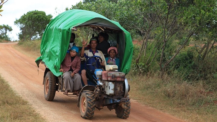 미얀마 북부에 위치한 샨 주의 핀다우로 가는 도중에 마주친 농민들이다. 경운기 엔진에 핸들을 달아서 이동용으로 사용하고 있다. 짐과 사람 다 실어나른다. 낯선 곳에서 마주친 이방인들에게 손을 흔들어 포즈를 취해준다.