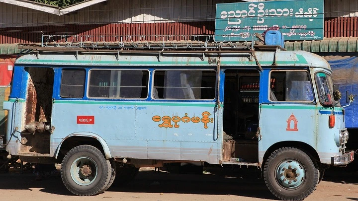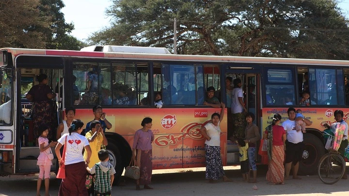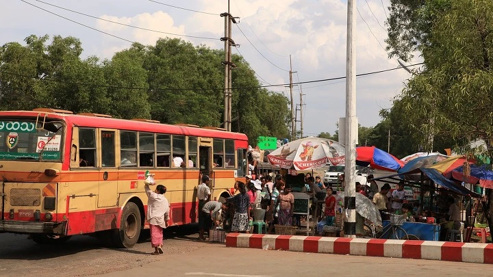 양곤시 외곽에서 본 버스이다. 상태가 열악해 보이지만 그나마 이 정도면 아주 훌륭한 교통수단에 들어간다. 버스가 정차하면 정류장마다 물건을 파는 사람들이 몰려든다.