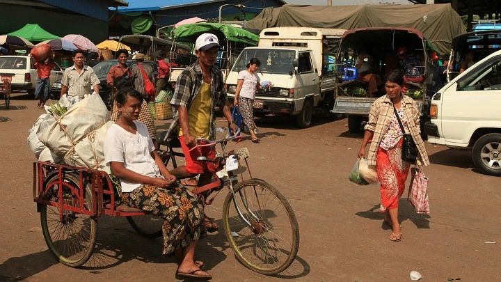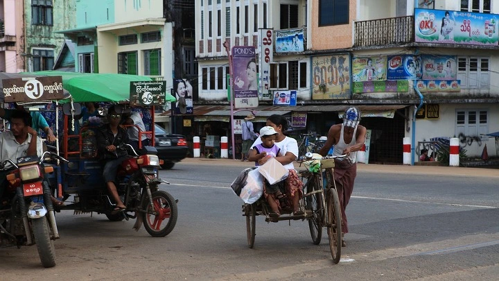 양곤의 베리 밍글라 시장에서 짐을 나르는 자전거 화물차이다. 더운 날씨에 무거운 짐과 승객까지 실어나르는 게 보통일이 아니겠지만, 이들에게 유일한 자산인 몸을 이용해서 할 수 있는 일 중에 하나이다. 이들의 튼튼한 두 다리에 수많은 가족들의 생계가 달려 있다.