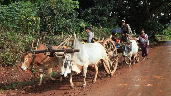 시골로 가면 두 마리의 소가 끄는 달구지들을 쉽게 볼 수 있다. 숫 소가 등에 혹이 난다고 하는데 소는 여전히 미얀마에서는 중요한 노동력으로 활용되고 있다. 나무로 만든 커다란 바퀴가 인상적이다.