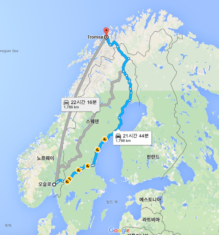 오슬로에서 트롬소(69°39'15.9"N 18°57'21.1"E)까지 어떻게 갈 것인가? 비행기 또는 자동차? 역시 구글신이 답을 준다. 자동차는 22시간이 걸린다. 노르웨이 북극로를 따라서 좁은 길을 갈 수도 있고, 스웨덴을 거쳐 넓은 길을 갈 수도 있다. 이틀간 정말 열심히 운전해야 한다. 가능할까? 우리는 트롬쇠에 더 집중하기로 했다. 트롬쇠 주변의 피요르드 해안을 더 탐색하는 게 낫지 않을까? 결국 국내선을 타기로 결정했다.