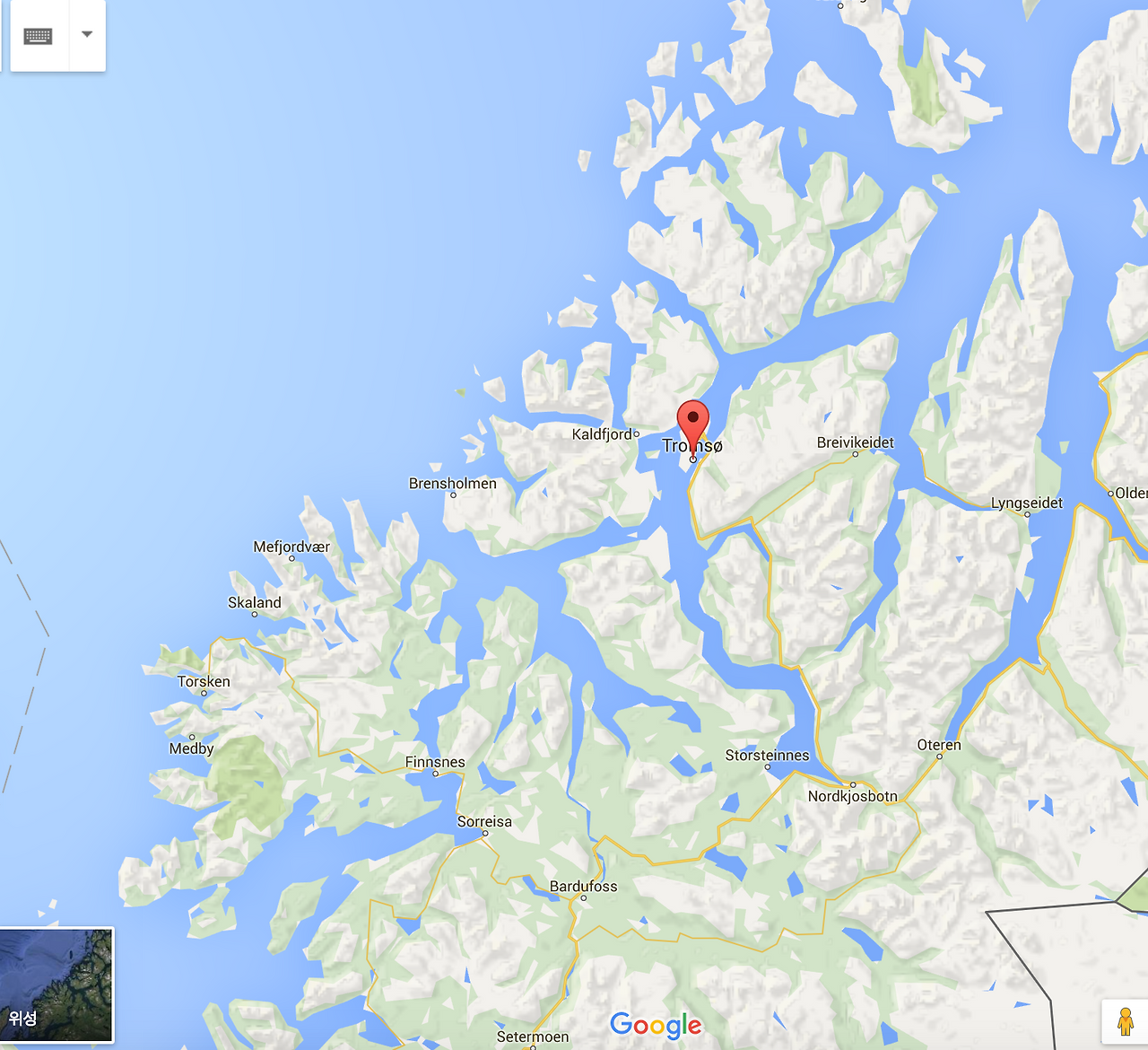 트롬쇠는 피요르드 해안의 섬들이 모여있는 곳의 중심도시로 인구는 7만 정도이다. 피요르드 해안. 지리 시간에 배운 용어이다. 얼마나 대단할까. 구글 지도가 보여주는 모습만으로도 이미 기대를 가지기에 충분했다. 지형은 마치 얼음꽃이 핀 것처럼 구불구불, 들쭉날쭉하다. 멋진 사진을 찍을 수 있을 것 같은 기대감이 들었다.