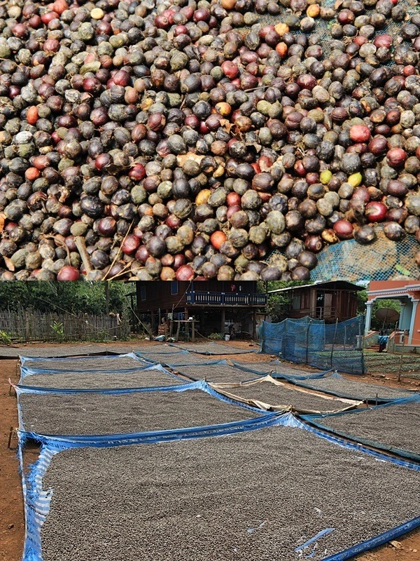 아라비카는 11-12월에 주로 생산되고, 로부스타는 1-2월에 생산된다. 우리가 방문한 3월 말의 볼라벤 고원은 바쁜 커피 수확 작업은 끝이 나고 한가한 철이었다. 가끔씩 주택 마당에서 커피를 말리는 광경이 이채로워 보였다. 아마도 끝물을 수확한 로부스타 일 것이다.