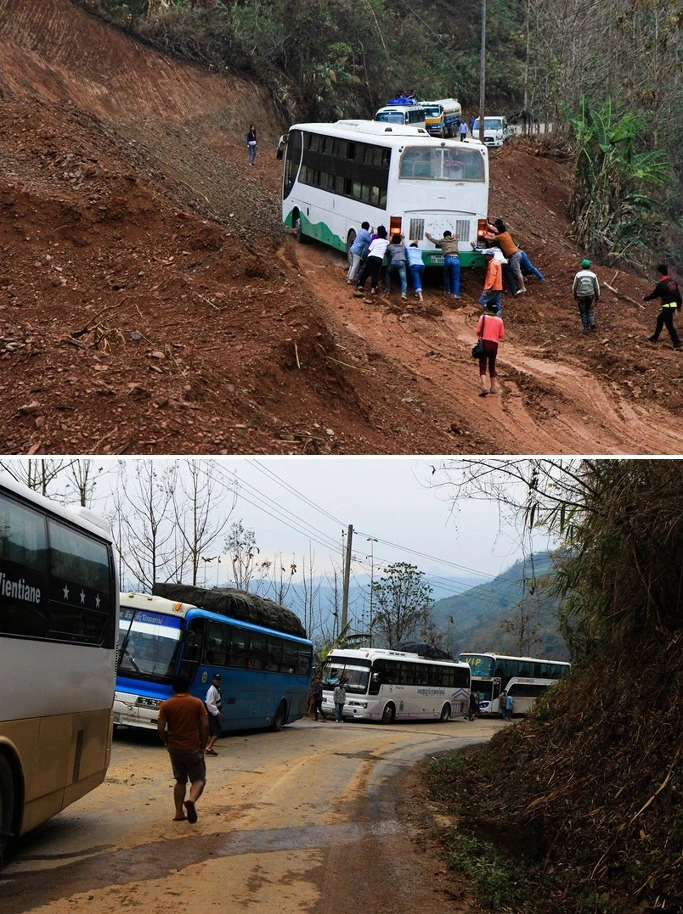 멈춰버린 차 안의 공기는 더 갑갑하게 느껴졌고, 새벽의 한기는 기세를 떨쳤다. 라오스 여행은 원래가 이렇게 하는 것이긴 하지만, 금요일 밤차를 이용해서 주말여행을 하는 여행자에겐 받아들이기 어려운 지체였다. 새벽이 밝아 오자 드디어 산사태가 난 곳을 볼 수 있었다. 밖에서는 이미 운전자들이 무너진 곳을 찾아 땅을 고르고 있었다. 길에 쏟아진 진흙이 어느 정도 정리되자 사람들이 함께 버스를 밀었다. 그렇게 갇혔던 버스가 빠져나가자, 길가에 늘어섰던 긴 버스의 행렬이 다시 움직이기 시작했다. 멈춰 선 지 여섯 시간 만에 버스는 다시 길을 떠날 수 있었다.