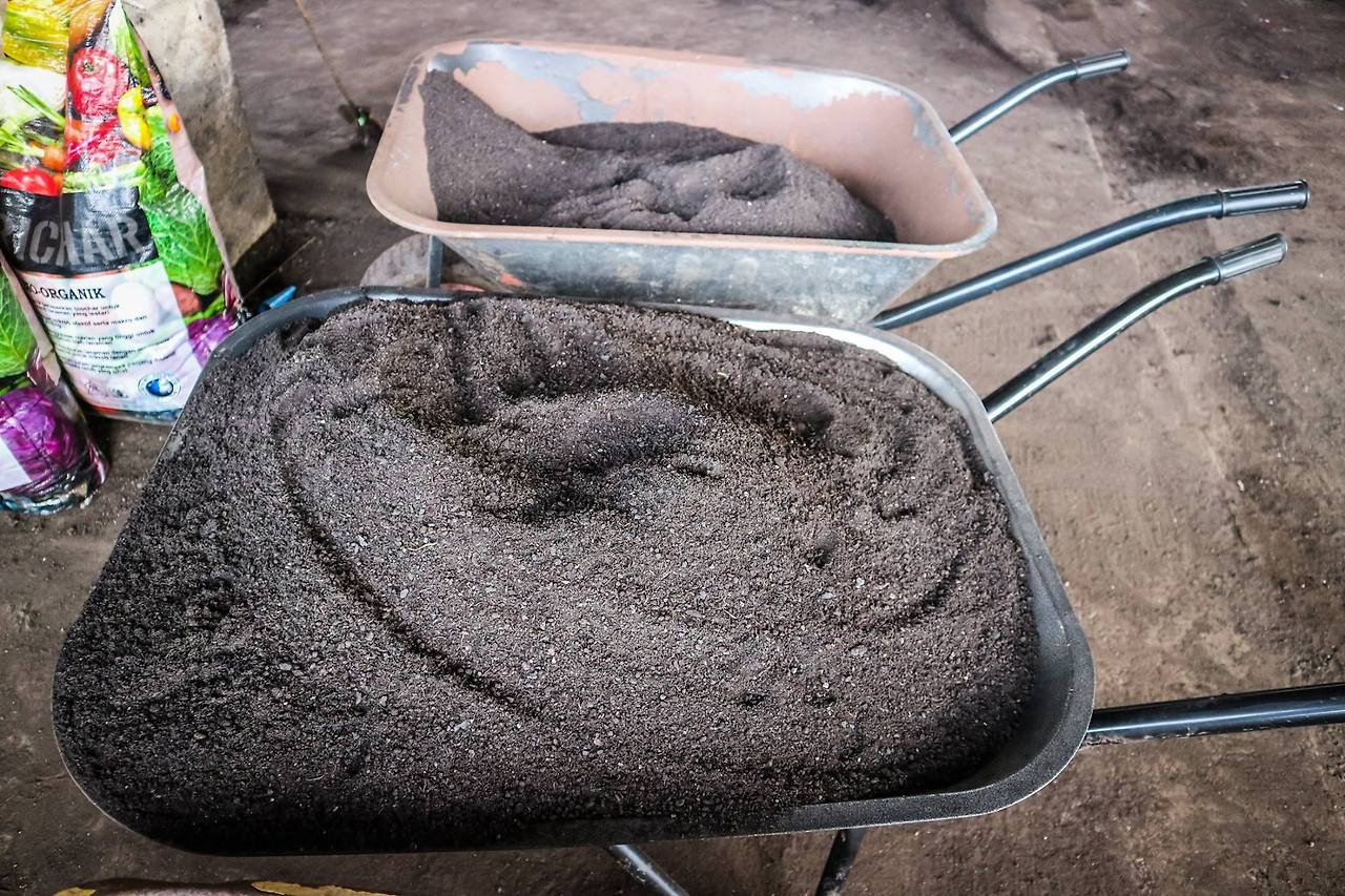 딱딱하던 EFBs의 모습은 6개월 후면 완전히 부드러운 입자상 유기질비료가 됩니다. 여기에 말레이시아 농업연구청(MARDI)에서 이전한 기술로 바이오 차르와 유기 양분을 첨가하여 최종적으로 유기질비료를 만듭니다. 그래서 그런지 비료의 수분 함량이 더 안정적이고 색깔이 검은 게 좋은 품질처럼 보였습니다.