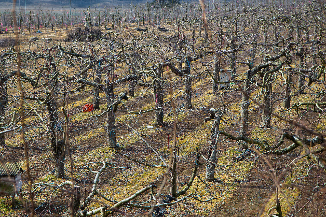 하얀 사과꽃이 필 때면 오래된 과수원은 양탄자처럼 변한다. 과수원 바닥이 보이지 않을 정도로 꽃이 촘촘하다. 요즘은 농작업 하기 편하게 나무는 작게 골은 넓히고 가지는 열 방향으로 잡는 이태리식 사과 재배방법이 널리 사용된다. 그래서 꽃이 핀 과수원은 양탄자가 아니라 커튼처럼 보인다.