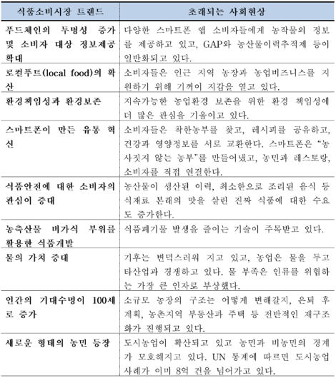 식품소비 부문에서는 더 큰 변화가 일어나고 있다. 소비자들은 자신이 먹는 음식이 어떻게 만들어지고 어디서 오는지 관심을 가지기 시작했다. 이런 소비자의 관심은 농장에서 슈퍼마켓, 농장에서 레스토랑까지 푸드 체인(food chain) 전반에 영향을 미치기 시작했다. 푸드 체인 전반에서 어떻게 투명성을 확보하고 소비자가 필요로 하는 정보를 제공할 것인가는 시장의 승패를 판가름하는 요소가 되어가고 있다. 유기농산물, GAP와 이력추적제, 동물복지농장 인증, 로컬푸드 등 수많은 인증제도가 소비자의 선택을 받기 위해 시장에서 경쟁하고 있다. 최근 일어나고 있는 농식품 트렌드 요약하면 다음과 같다(표 1).