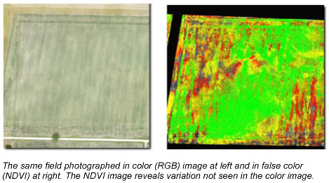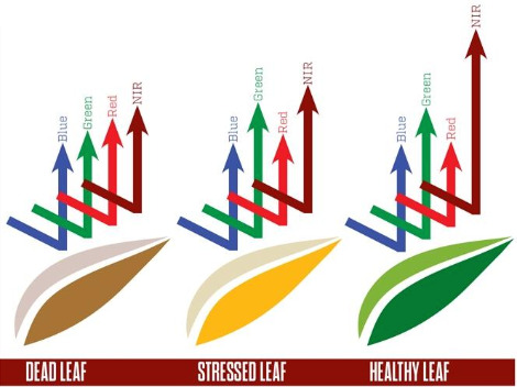 식물은 가시광선 파장의 빛을 광합성을 위해 흡수한다. 그렇지만 근적외선(NIR) 파장의 빛은 광합성을 하기엔 충분하지 못하지만 잎의 열을 올리는 역할을 한다. 따라서 식물은 NIR 파장의 빛을 반사한다. 이 반사 메커니즘은 식물이 죽었는 지를 판단하는 데 활용할 수 있다. 이러한 특징을 활용하여 NIR 파장의 반사도와 가시광선의 반사도를 비교함으로써 더 많은 정보를 추정할 수 있다. 이를 NDVI(normalized difference vegetation index)라고 한다. 강한 NDVI 신호는 식물의 밀도가 높은 걸 나타내고, 약한 NDVI 신호는 문제가 있다는 걸 나타낸다.