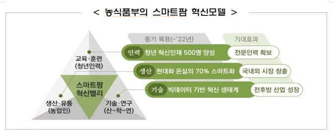 농식품부는 혁신성장 핵심 선도과제 중 하나로 「스마트팜 확산 방안」을 발표(제5차 경제관계장관회의, ‘18. 4.16.)하였다. 여기에는 스마트팜 확산·고도화를 위한 주요 정책과제로 1) 청년 창업 생태계 조성, 2) 산업 인프라 구축, 3) ‘스마트팜 혁신밸리’를 제시하였다.