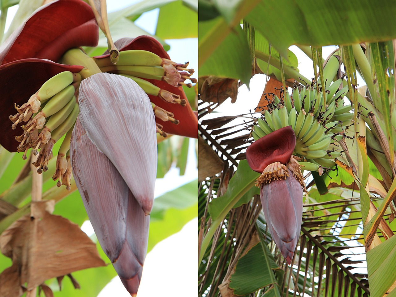 바나나 씨가 없다고 나무에 꽃까지 없는 건 아닙니다. 단지 수분이 되는 기능이 퇴화했을 뿐입니다. 바나나 끝이 검은 것은 바바나 꽃이 마르면서 생긴 자국입니다. 바나나는 한 나무에 어른 팔뚝만한 수꽃이 하나씩 있습니다. 이걸 나물로도 먹습니다. 수꽃 아래 줄기에는 바나나 다발이 생기고 그 바나나에는 꽃이 달립니다. 원래는 수분이 되어 씨앗이 맺혀야겠지만, 바나나는 “왕년에 나도” 그랬다는 듯 그냥 폼만 잡습니다. 그래서 식물호르몬이 없이도 먹음직스러운 바나나 과육을 만듭니다. 이걸 단위결실(單爲結實)이라고 합니다.