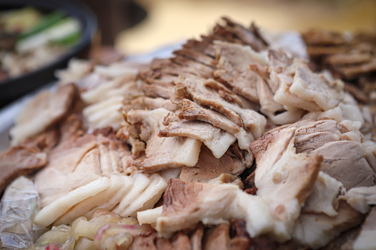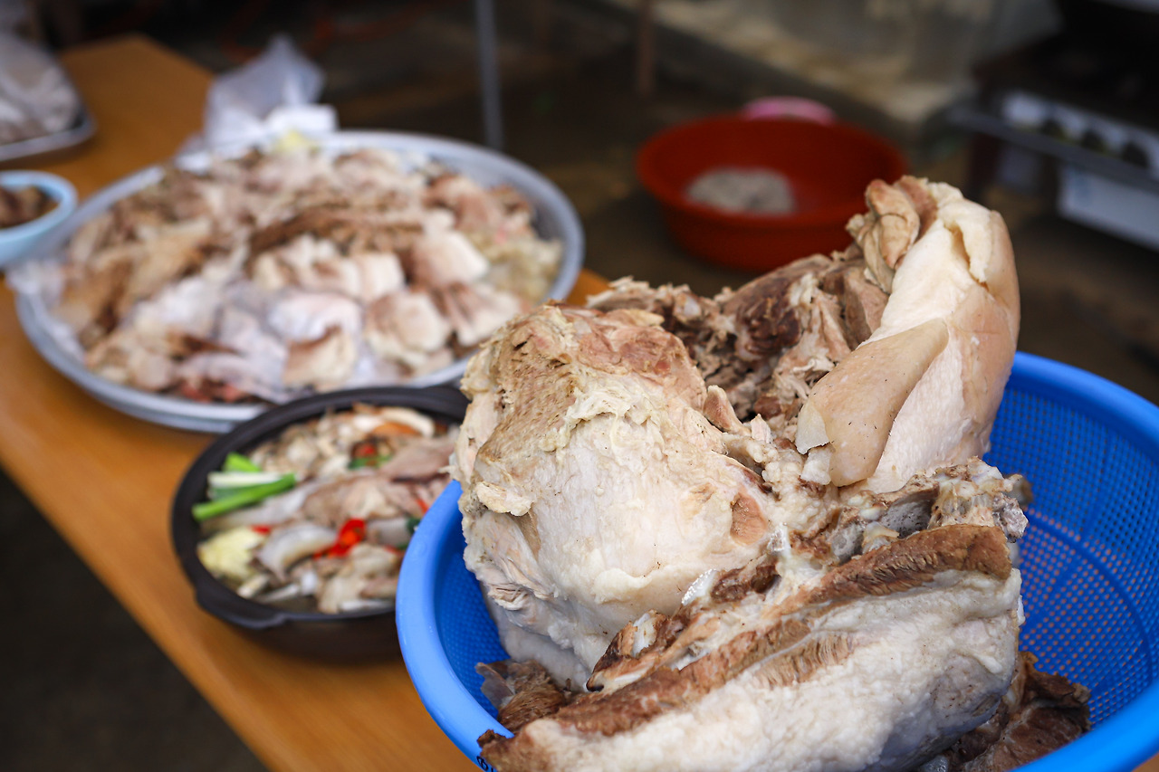 세배 많은 시간이 어떤 차이를 만들어 내는가 하면, 그간 먹은 돼지고기는 모두 잊는 게 좋습니다. 돼지고기 수육은 식감이 쫄깃하고 비게 마저 탄력이 넘칩니다. 돼지고기 국물은 구수한데 깔끔합니다. 원래 돼지고기는 이래야 하는 거죠. 작년 박찬일 쉐프에 이어 올해는 임현식 쉐프가 칼을 잡았습니다.