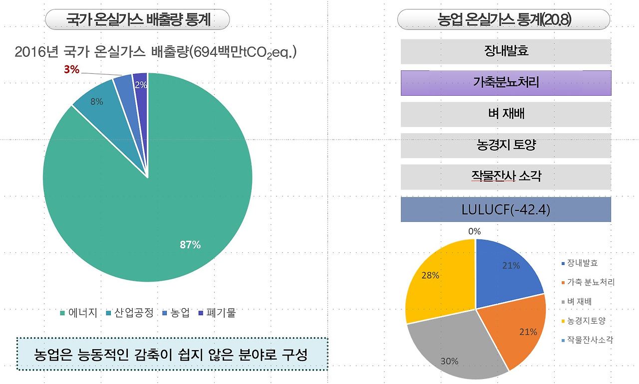2. 그런데 우리나라의 경우를 보면 농업은 3%를 배출합니다. LULUCF(토지이용과 산림경영)까지 더하면 오히려 3% 정도 흡수합니다. 우리나라 전체로 보면 농림업은 흡수원입니다. 폐기물 처리에서 배출되는 만큼을 흡수하고도 남습니다(그림 2).