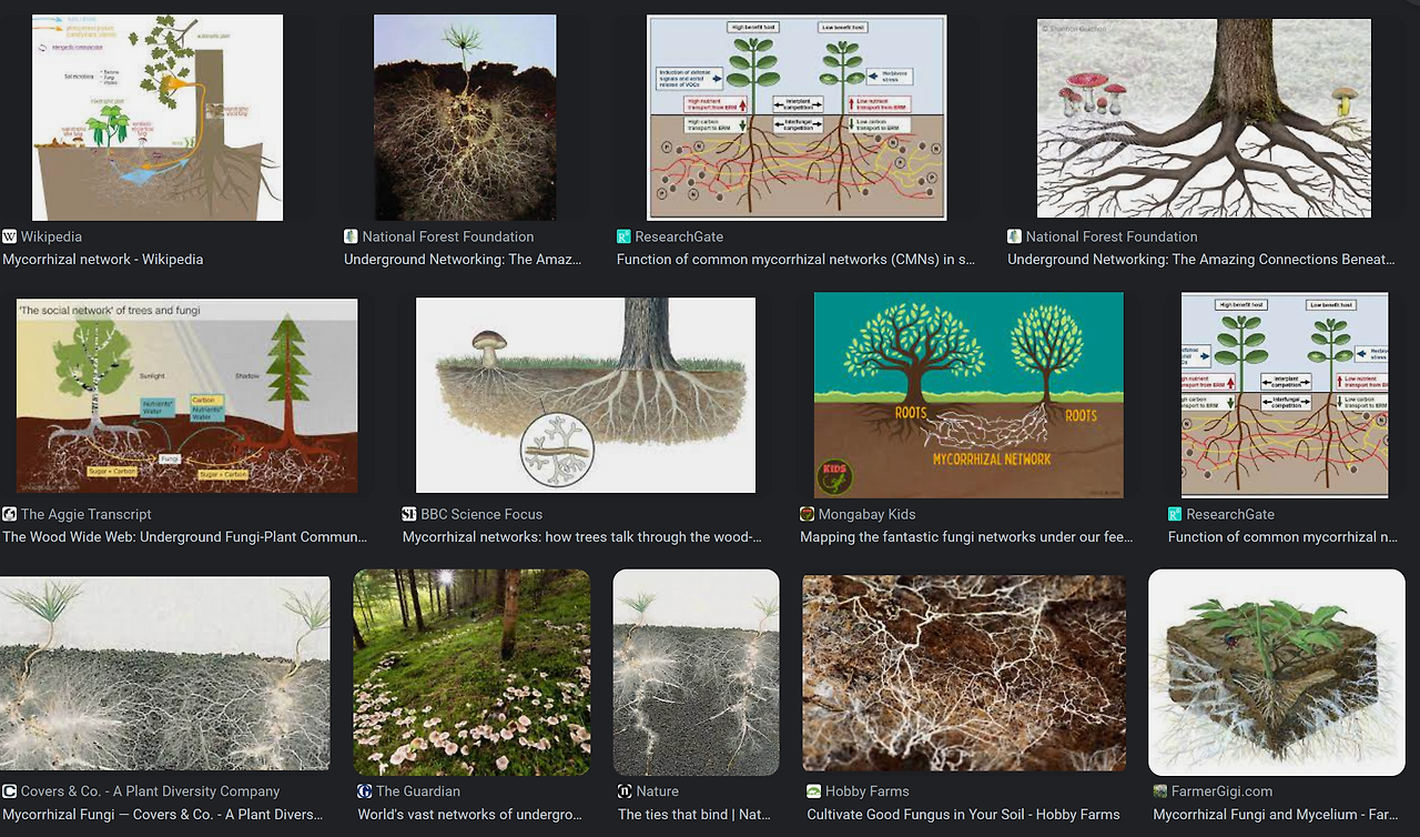 지구상에 존재하는 모든 생물종의 25%는 지하에 살고 있고, 이 중 균근균이라 불리는 곰팡이들은 나무와 숲을 연결하는 소셜 네트워크 역할을 한다. 이름하여 “곰팡이 고속도로 (fungal highway)” 수잔 사마드는 이걸 Wood Wide Web(WWW)이라고 명명했다. 이 WWW를 통해서 식물들은 서로 소통하고 영양분을 분산할 수 있게 해 준다(이 부분은 검증이 필요하다). 식물은 광성합을 통해 생성된 양분을 뿌리를 통해 땅속 유기체에 당분을 공급하고 이 과정에서 대기 중의 탄소를 토양에 저장한다.
