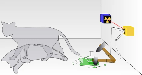 상자 안에 고양이가 한 마리가 갇혀 있고, 그 상자 안에는 독가스가 들어 있는 병이 있다. 병은 마개로 막혀 있고 병 근처에는 망치가 세팅되어 있다. 이 망치는 가이거 계수기와 연결되어 있어서 가이거 계수기가 작동하면 망치가 병을 내리쳐 독가스가 흘러나와 고양이를 죽인다. 가이거 계수기 옆에는 우라늄 조각이 놓여 있다.