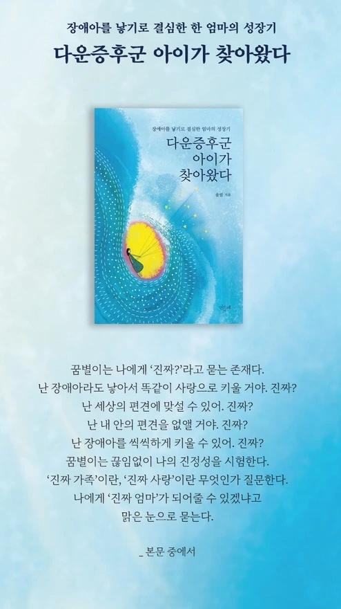 다운증후군 아기의 탄생은 아직도 ‘당연한 일'이 아닌 것이 우리의 현실이다. 아이의 장애를 알고서 출산을 선택한 저자는 흔히 장애아 양육자들에게 덧씌워지는 '좋은 엄마 판타지'를 당당히 거부한다. 갈등하고, 기뻐하고, 고통에 몸부림치며 성장하는 모습을 솔직하게 내보이는 그녀의 고군분투 성장기는 아직도 현재진행형이다. 그 솔직한 고백이 어떤 이에겐 위로로, 어떤 이에겐 용기로 전해지기를 바란다.