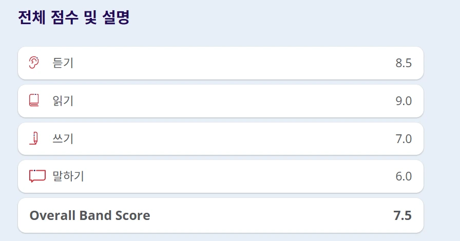 독학으로 준비한 IELTS의 첫 점수는 Overall 7.5였다. 높은 점수지만, 항목별로 뜯어보면 기분이 마냥 좋을 수만은 없다. Reading 9.0, Listening 8.5, Writing 7.0까지 나쁘지 않았는데 Speaking이 무려 6.0이었다. 리딩 만점에 방방 뛰어야하는데, 현저하게 낮은 스피킹 점수는 나에게서 마땅히 누려야 할 기쁨을 앗아갔다. 이 기괴한 괴리는 전형적인 대한민국 영어 교육의 산물이다.