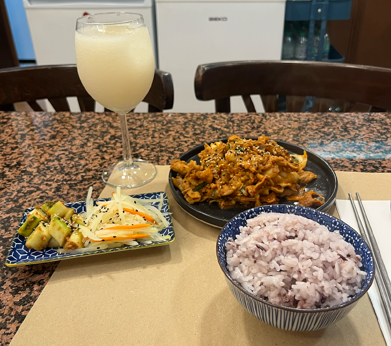 여긴 한국인 순례자들에겐 이미 너무 유명한 곳이다. 프랑스길을 걷는 순례자라면 제대로 된 한식을 먹을 수 있는 첫 번째 장소이기도 하다. 여러 명이 식사를 하면 다양한 메뉴를 주문해 나눠먹어도 좋을 것 같다. 한국 밥솥으로 지은 흑미밥이 맛있었고, 4유로에 판매하는 막사는 환상적이었다. 평일 점심에 워크인으로 방문했다가 식사를 못하고 돌아왔기에 미리 예약을 하고 방문하는 걸 추천한다. 메뉴는 제육볶음, 간장불고기, 잡채, 간장계란밥, 찌개류 등이 있었다.