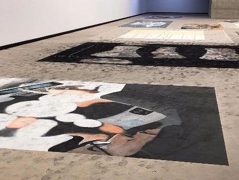 이 스물 두 장의 그림은 바닥에 꽤나 크고 넓게 '깔려 있다'. 그림과 그림 사이의 간격은 그다지 넓지 않은데, 마치 카펫 상점에서 여러 종류의 상품을 서로 겹치지 않게, 그러나 가능한 많은 상품을 내보이려 한 것처럼 보인다. 그러다 보니 처음엔 그림을 밟지 않으려고 애썼다. 그런데 그림들 위로 발자국이 마구 나 있는 게 아닌가! 처음엔 작가가 작업을 하며 남긴 발자국일 거라고 생각했지만, 그러기엔 꽤 많은 발자국이 남겨져 있었다. 다시 보니 그림 주변엔 여느 미술관처럼 작품 주변으로 접근을 금지하는 제한선 따위가 없었고, 그림을 밟아도 직원이 전혀 제지하지 않았다. 바닥에 그려졌기 때문에 전시가 끝나면 그대로 가져가 소장할 수도 없는 미술, 열심히 그렸지만 관람객들이 마구 밟아 훼손하게 되는 미술. 이 작업을 통해 작가가 이야기하고자 하는 건 무엇이었을까? 애석하게도 전시 설명책자에는 작가의 의도는 적혀있지 않고, '관람객들은 그림 위를 걸을 수 있다'고만 적혀 있을 뿐이다.
