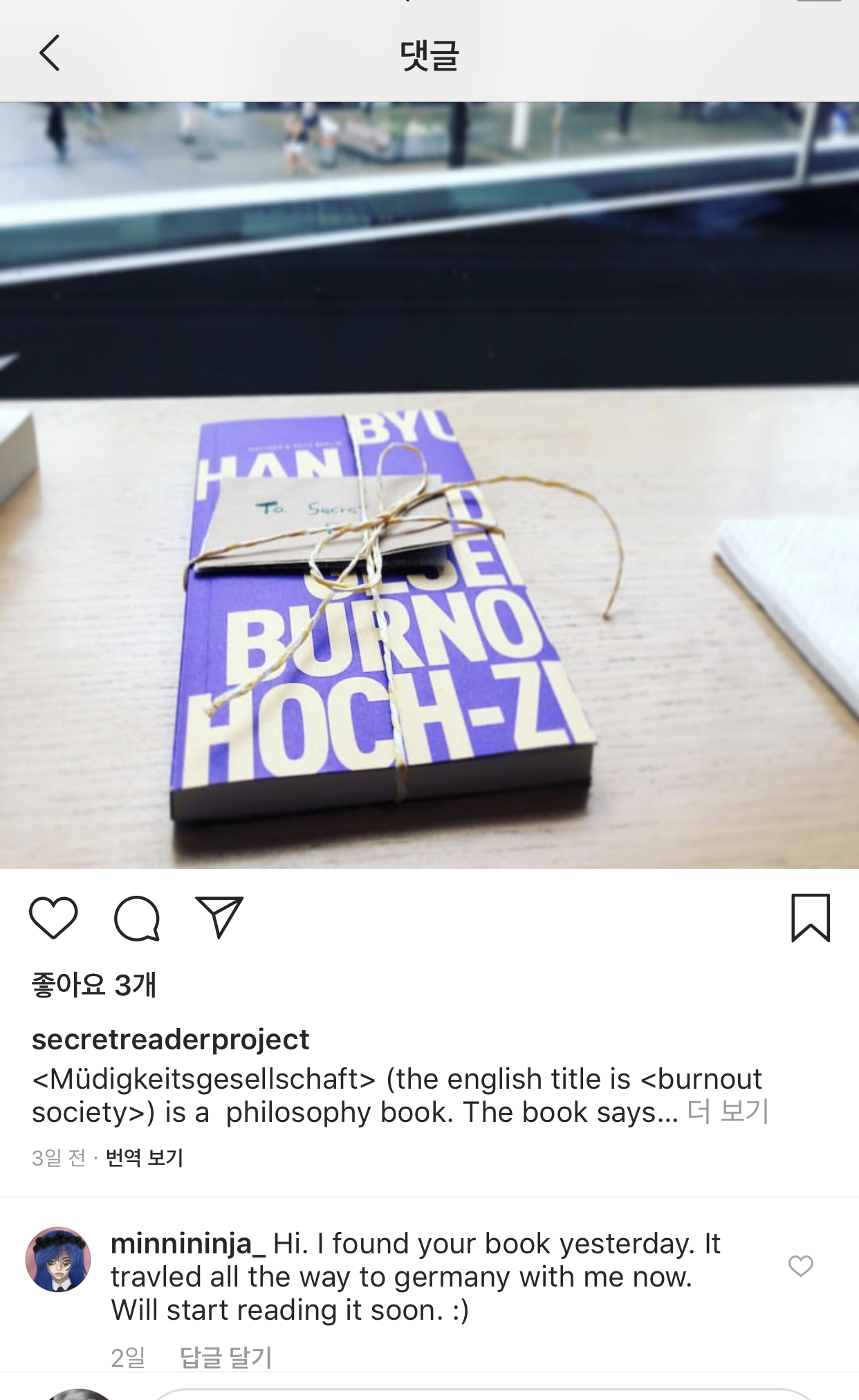 그 이후로는 아직까지 또 다른 비밀독서가의 메시지를 받은 일이 없지만, 언젠간 독서 후기도 메시지로 받는 날이 오지 않을까? 계정 소개에 적어놓았듯, 우리는 책으로 연결되어 있고 책으로 공감할 수 있으니까.