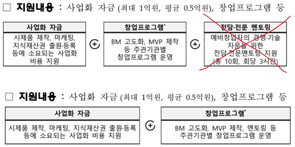 계속해서 진행해 오던 전담/전문가 멘토링이 사라졌습니다. 원래는 필수로 전담 멘토를 지정받고 필수로 멘토링을 받아야 하는 조건이 있었는데 올해부터는 없어진 것 인지, 다른 방법으로 진행되는 것인지 현재 공고문에는 빠져있습니다. 멘토링이 어떻게 보면 굉장히 귀찮고 꼭 해야 하나? 싶은 과정이긴 한데 또 반대로 멘토님을 잘 만나면 계속해서 관계를 이어가고, 많은 도움을 받을 수 있습니다.