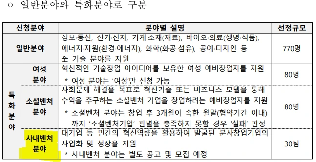 한 가지 눈에 띄는 점은 “사내벤처 분야”를 따로 뽑습니다. 확실히 기업 내에서도 창업을 많이 하기도 하고 우수한 아이템들이 많기 때문에 개별 선정을 하게 되는 것 같습니다. 별도 공고 및 모집 예정이라고 공지된 것을 보면 확실히 사내 벤처의 경우 모기업과의 여러 가지 관계 정리가 필요해서 그런 것 같습니다.