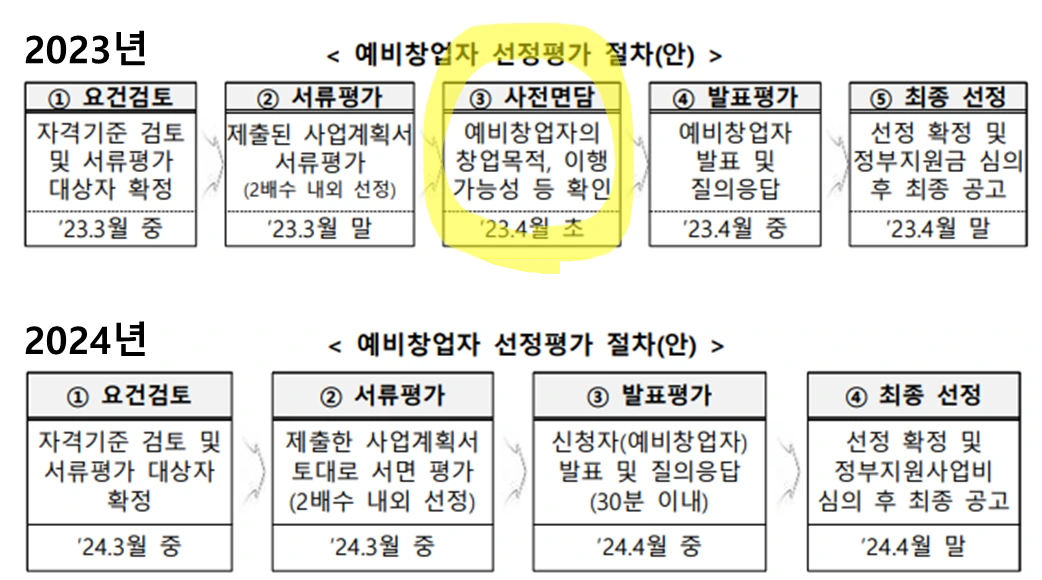 그에 맞춰 예비창업패키지도 매년 선정기준이 조금씩 바뀌고 있는 것 같습니다. 예를 들어 작년 예비창업패키지에는 서류통과 이후 발표평가 전에 ‘사전면담’이라는 절차가 추가되었었습니다. 사전면담을 통해 예비창업자 분들의 진정성을 확인하고자 했던 것 같습니다. (올해는 다시 사라졌습니다.)