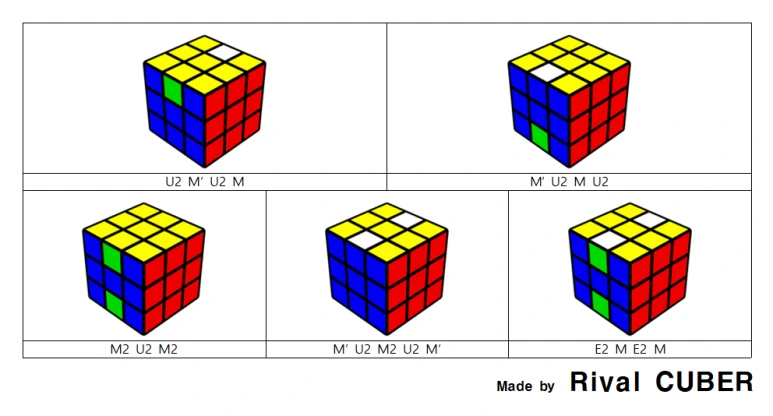 LSE를 한 번에 하는 것은 어렵기 때문에 일반적으로 3단계로 나누어서 적용합니다. M층을 맞추는 것은 그 마지막 단계로 L4E로 불리기도 합니다. 이 상황이 나오지 않은 경우 M2 등을 이용하여 위 5가지 상황 중 하나를 만들어서 공식을 사용해 주시면 됩니다.