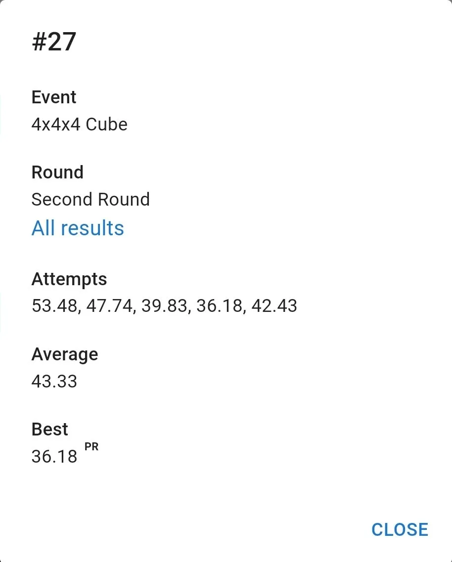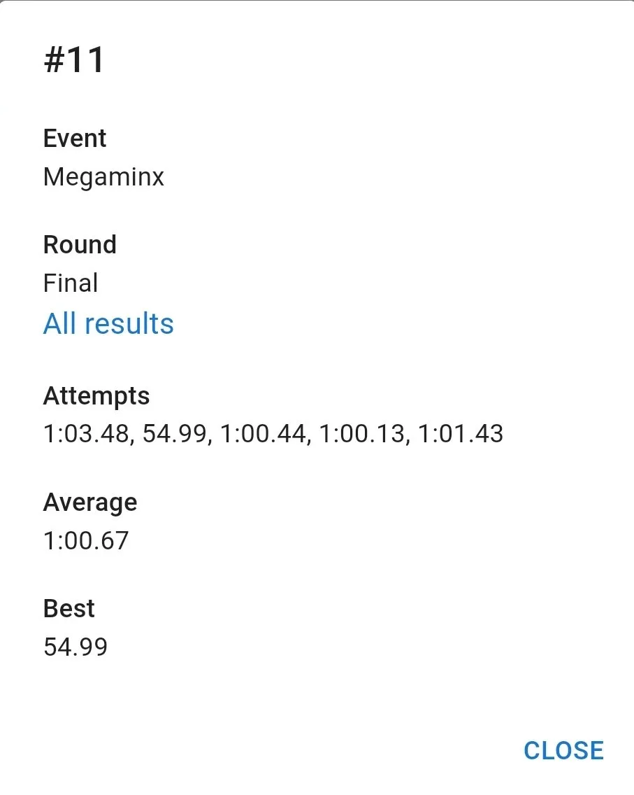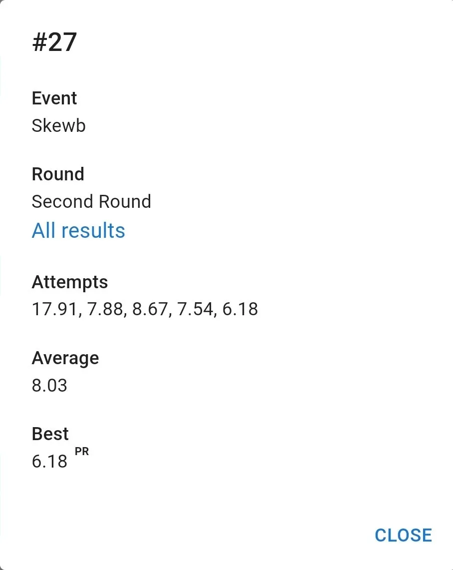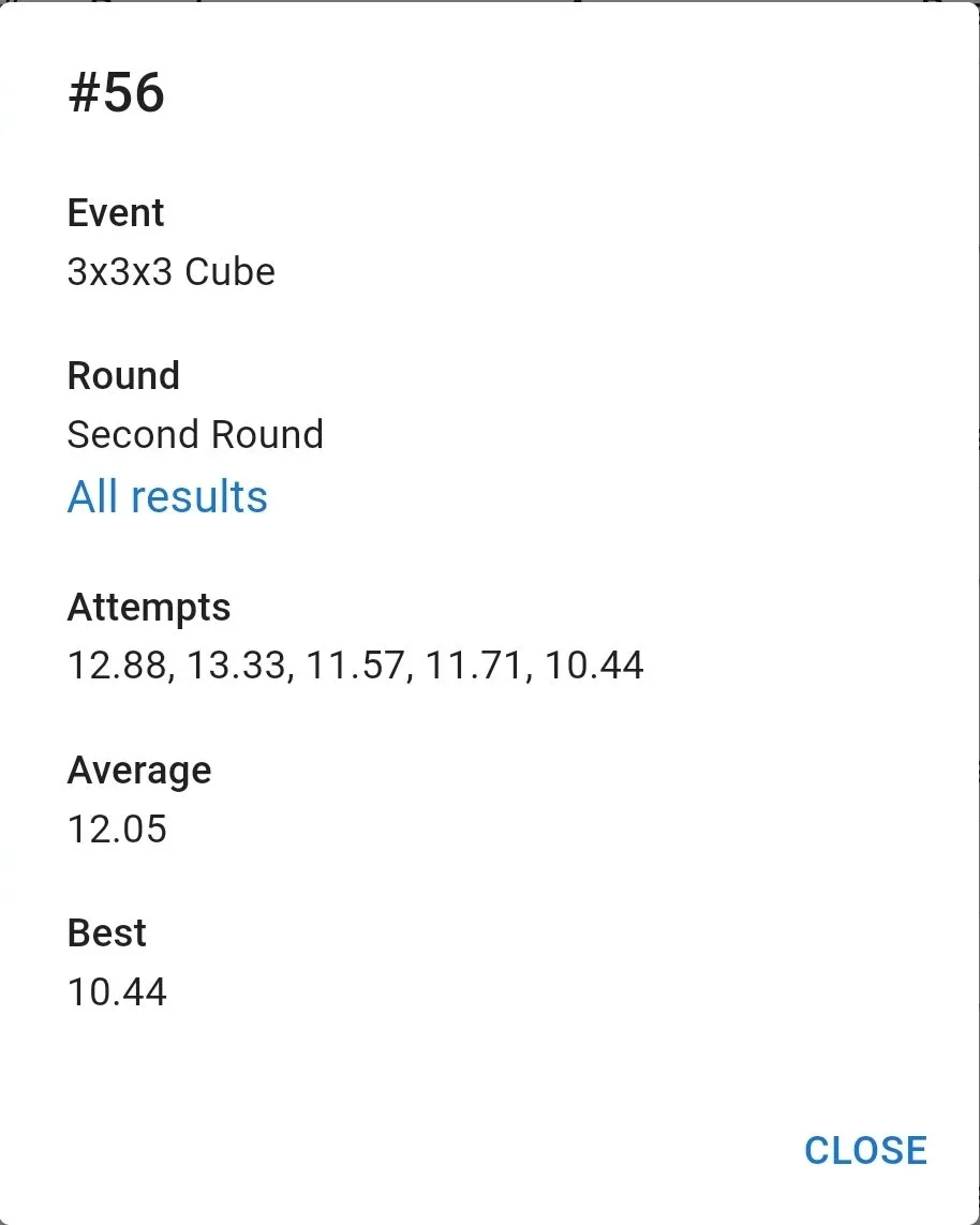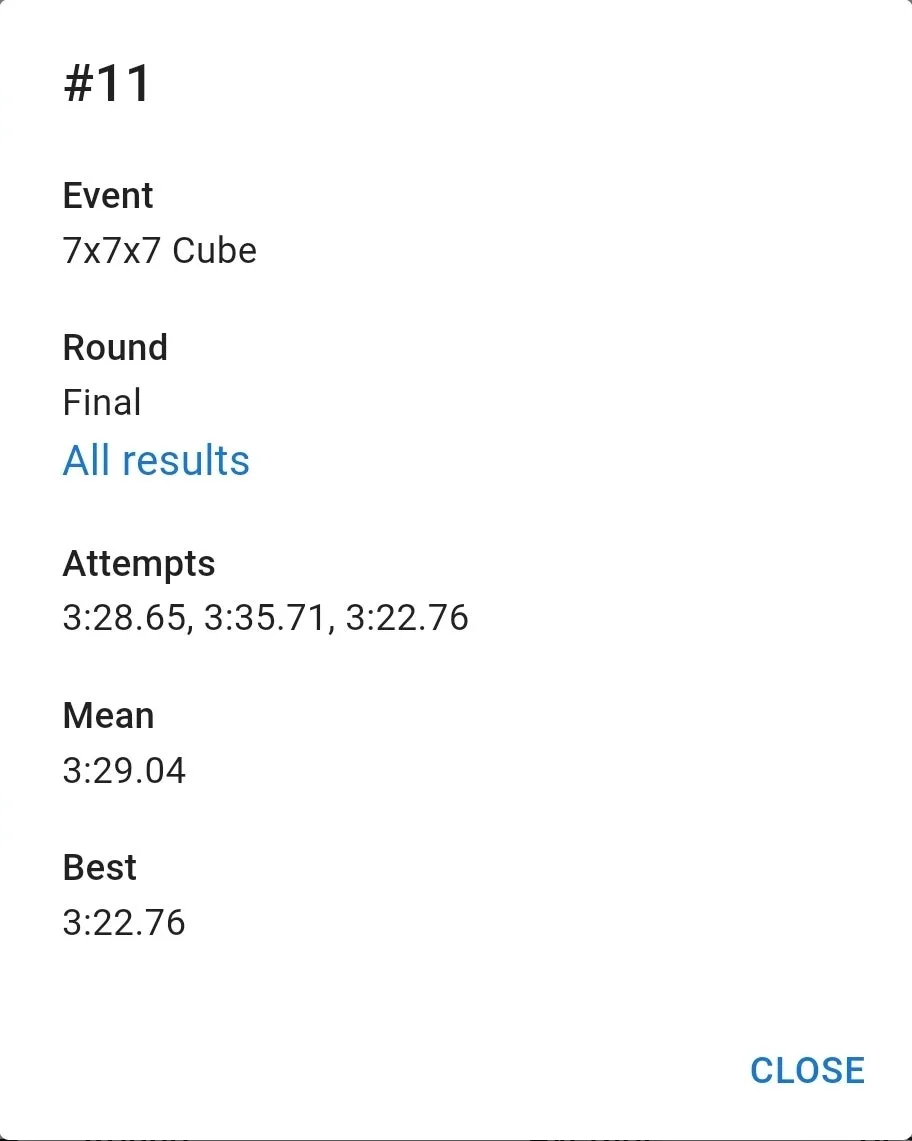 우여곡절 끝에 잰 77 기록은 만족스러웠습니다. 집 평균보다 잘 나왔고 무엇보다 항상 저를 괴롭히담 3분 50초대 기록이 전혀 나오지 않았습니다. 3분 23초 전체 10위. 결승 자체는 예상을 했지만 예상보다 높은 순위로 진출해서 좋았습니다.
