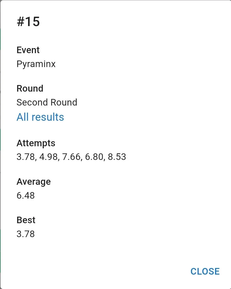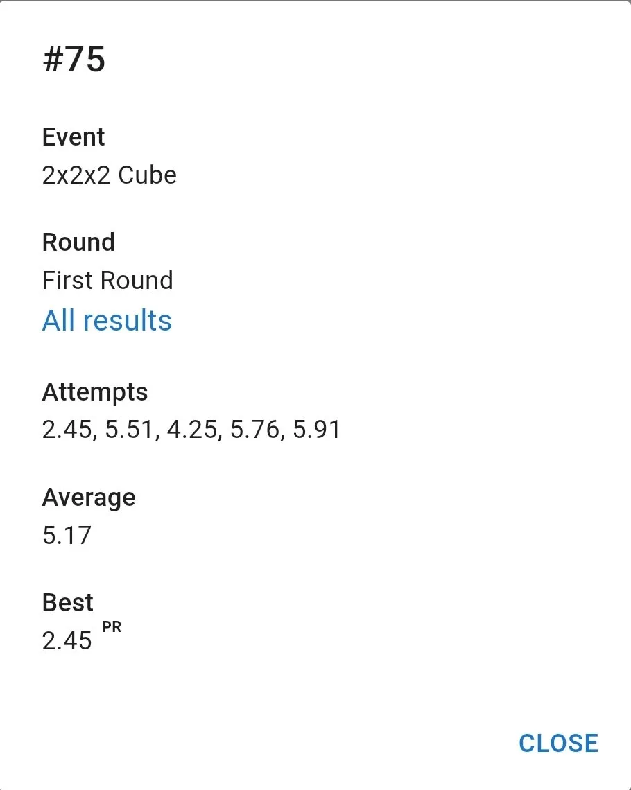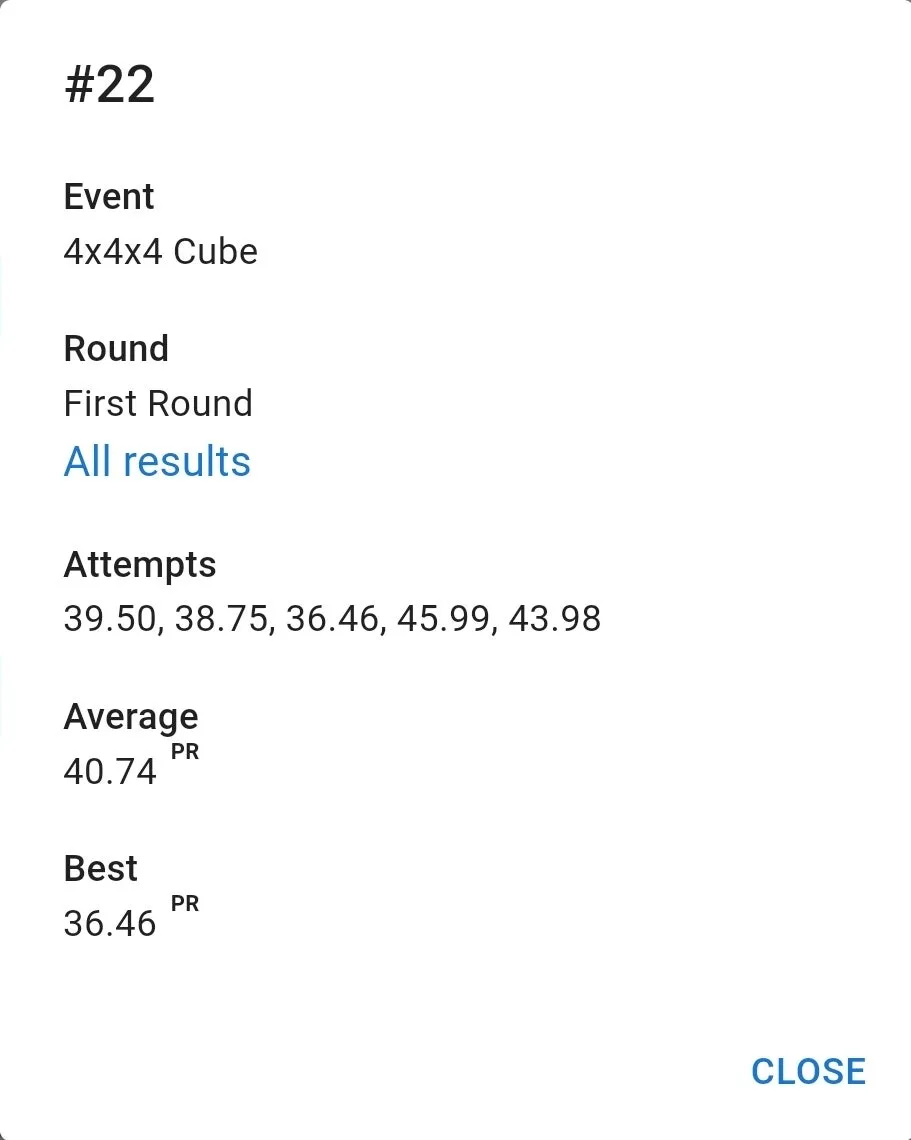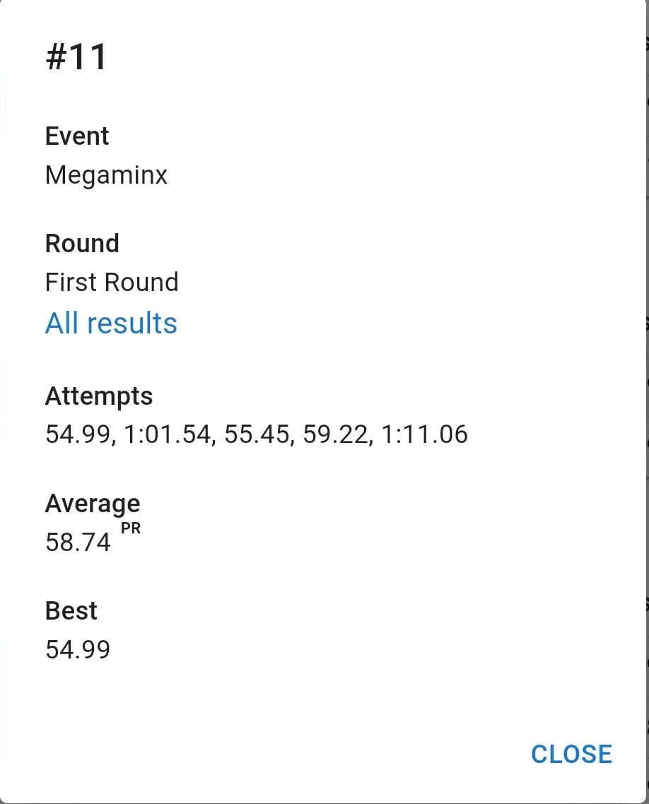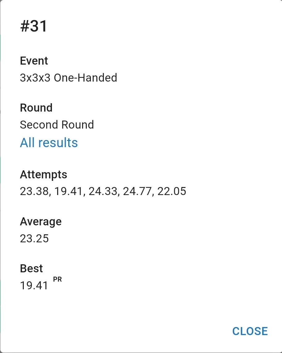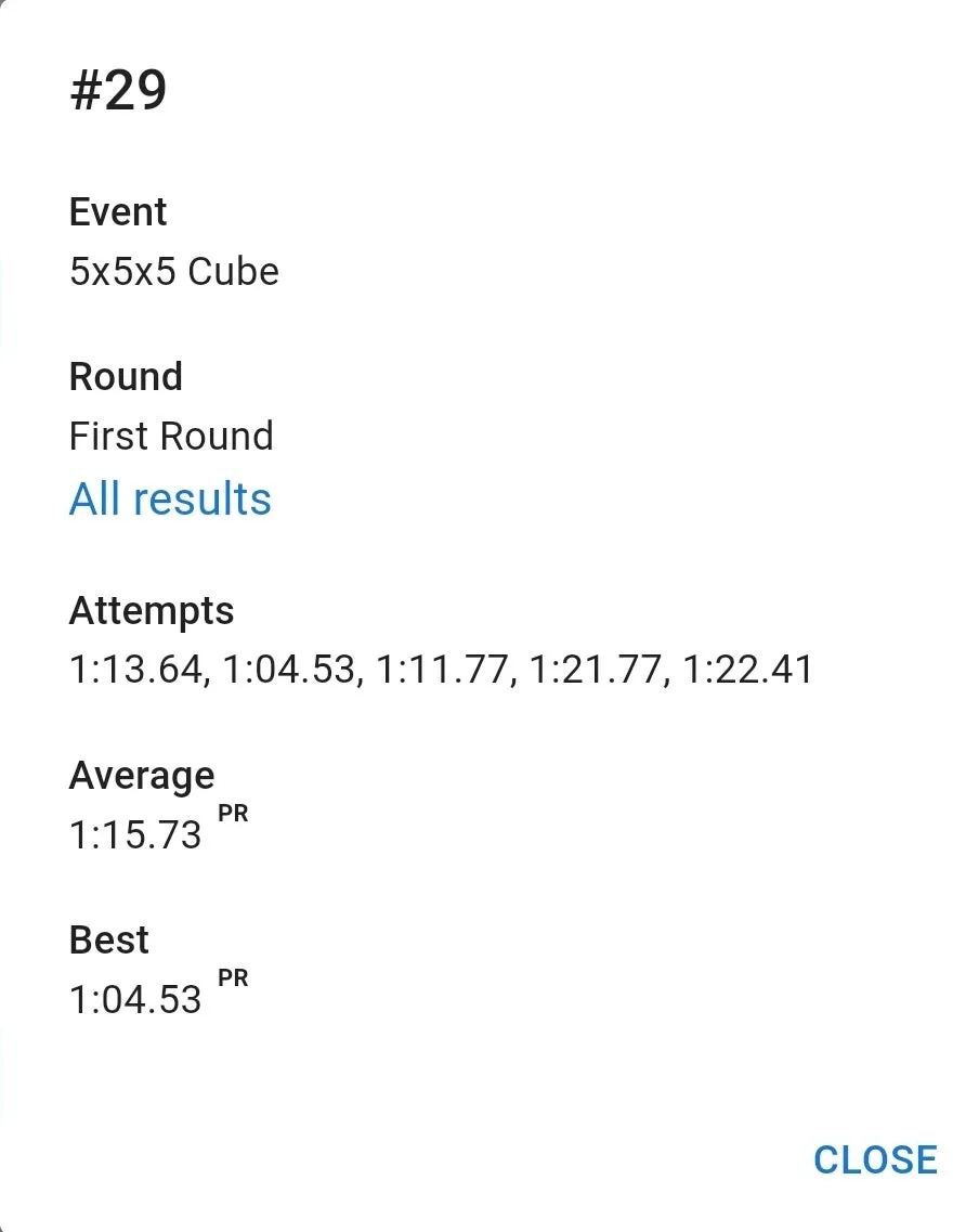 우여곡절 끝에 잰 77 기록은 만족스러웠습니다. 집 평균보다 잘 나왔고 무엇보다 항상 저를 괴롭히담 3분 50초대 기록이 전혀 나오지 않았습니다. 3분 23초 전체 10위. 결승 자체는 예상을 했지만 예상보다 높은 순위로 진출해서 좋았습니다.