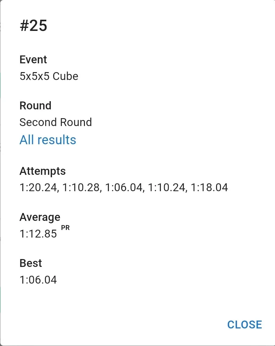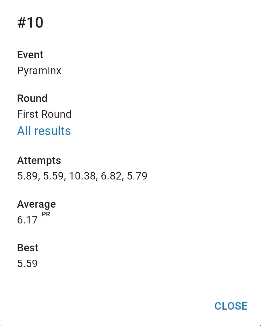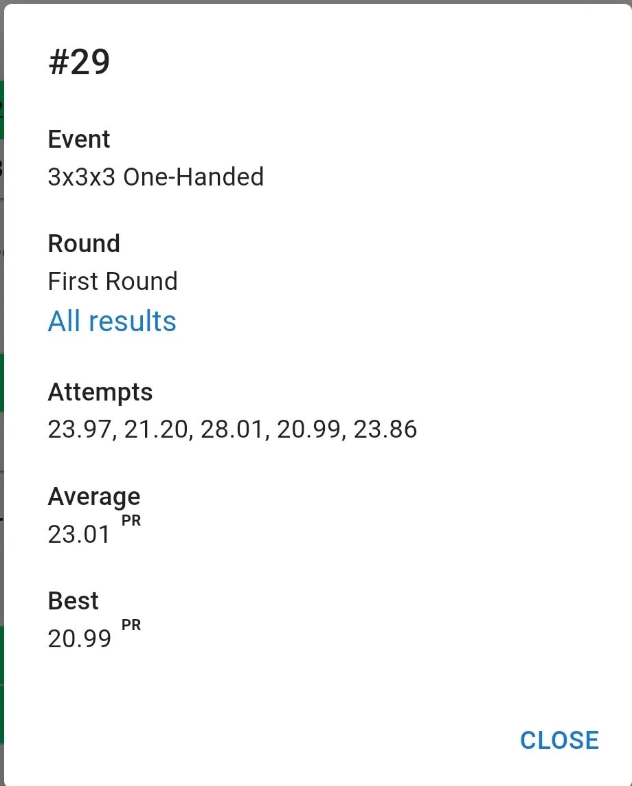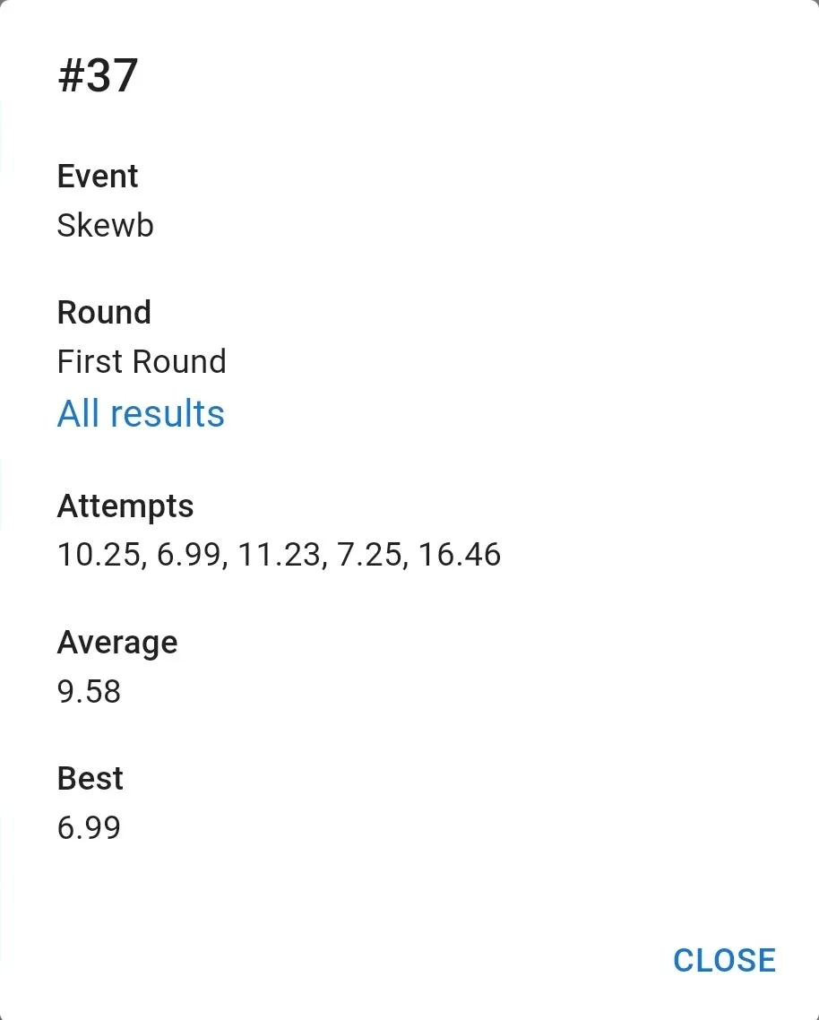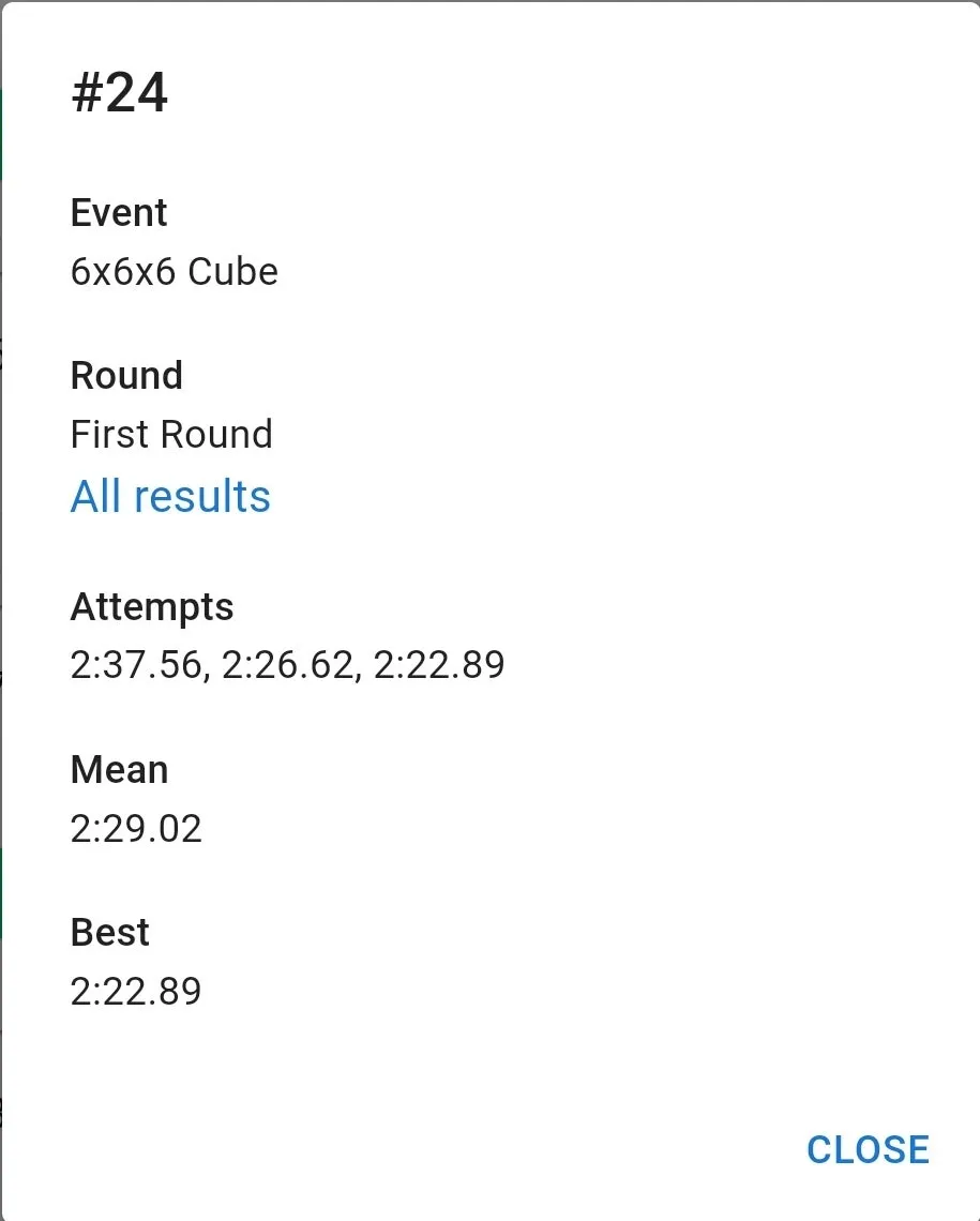 우여곡절 끝에 잰 77 기록은 만족스러웠습니다. 집 평균보다 잘 나왔고 무엇보다 항상 저를 괴롭히담 3분 50초대 기록이 전혀 나오지 않았습니다. 3분 23초 전체 10위. 결승 자체는 예상을 했지만 예상보다 높은 순위로 진출해서 좋았습니다.