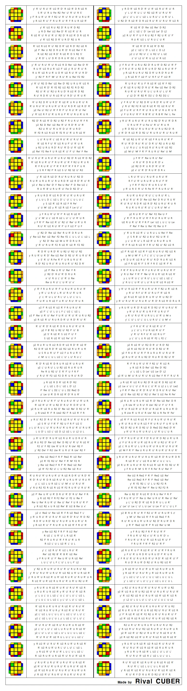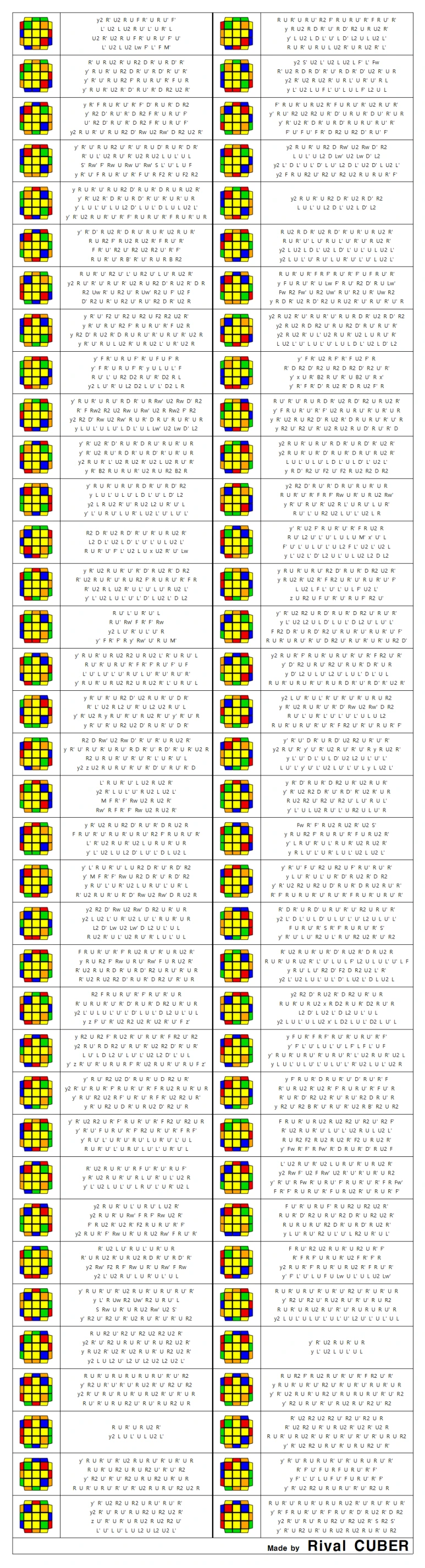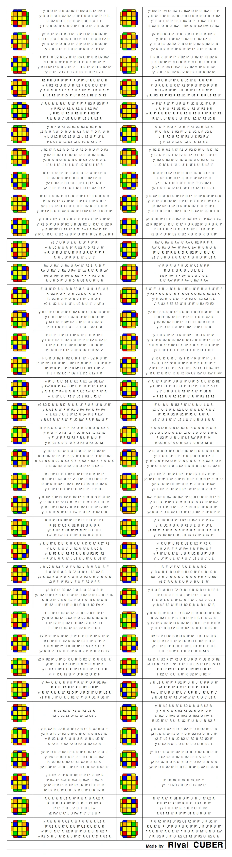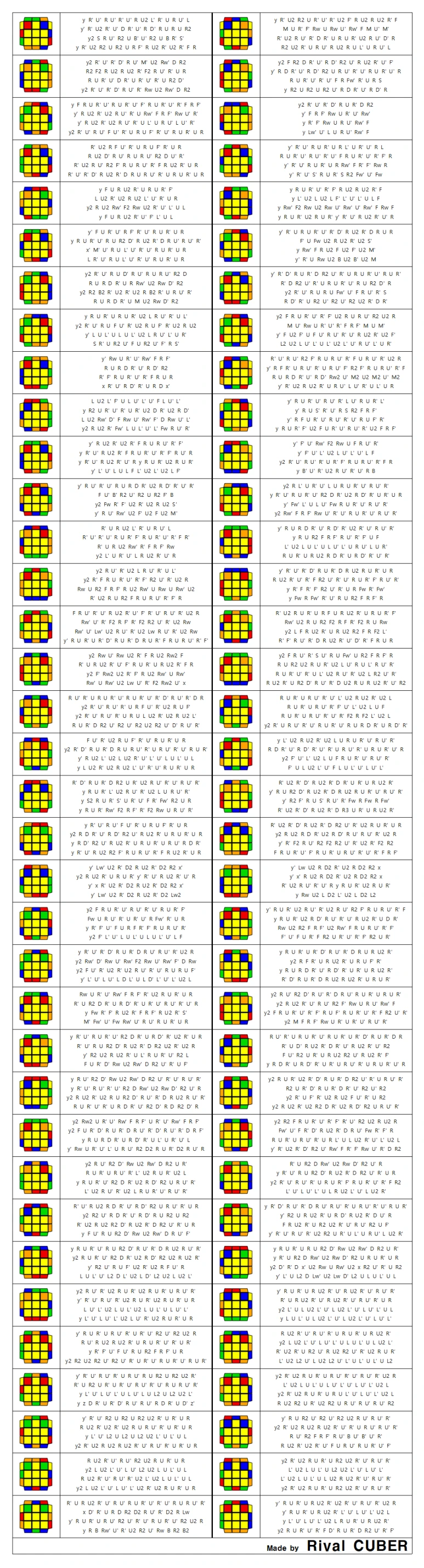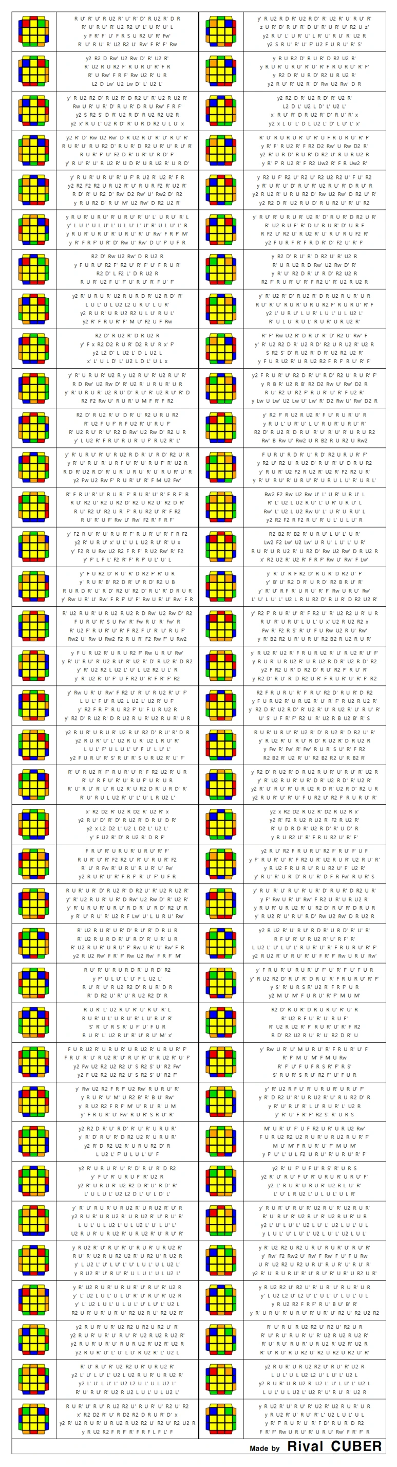 ZBLL은 F2L이 모두 맞은 상태에서 윗면 십자가가 맞춰져 있을 때 큐브를 한 번에 맞추는 공식입니다. PLL도 ZBLL에 포함되지만 여기는 수록하지 않았습니다. PLL 제외 총 472개의 공식이 있습니다. H 상황은 40개, 나머지는 72개의 상황으로 이루어집니다.