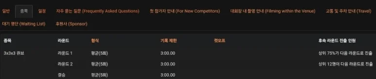 큐브 대회에서 순위는 단순히 순위 그 자체로 끝나지 않습니다. 내가 참가한 모든 종목에서 1라운드 탈락이 너무나도 당연한 수준이라면 의미가 없겠지만 후속 라운드 진출이나 입상이 걸려있다면 그날 일정을 그에 맞게 조절할 필요가 있죠. 후속 라운드 진출이 예상된다면 후속 라운드가 끝날 때까지 시간을 확보해 놓거나 다음 라운드 진출 기준에 들어가더라도 포기를 해야 합니다. 후속 라운드 진출 자체가 단순한 순위보다 더 큰 의미가 될 수도 있고요. 오늘은 큐브 대회에서 본인의 순위를 예측하는 방법에 대해 알아봅시다.