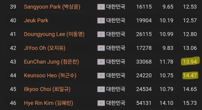 그리고 공인 기록 기준 43위는 정은찬 선수의 13.94입니다. 44위로 늘려도 허근수 선수의 14.47이죠. 이 기록이 각 선수들의 가장 잘 나온 평균기록임을 감안하면 실제 커트라인은 대략 15나 16 정도에 형성된다고 볼 수 있을 겁니다. 전체 참가자의 75%나 2라운드에 진출한다는 건 살릴 수 있는 최대한의 사람을 살리겠다는 것인데도 불구하고 커트라인이 10초대 중후반에 형성되는 걸 보면 만만한 대회가 아님을 알 수 있습니다.