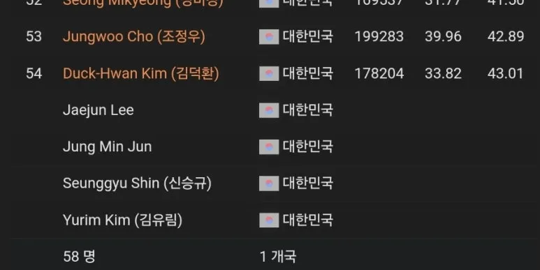 대회 참가가 시작된 이후로는 우리에게 매우 중요한 정보가 주어집니다. 바로 대회 참가자의 공인 PR, 즉 대회에서 작성된 가장 좋은 기록이죠. 참가자의 실력을 바로 알 수 있기 때문에 훨씬 높은 정확도의 예측이 가능합니다. 그냥 참가자의 실력을 줄 세운 뒤 내 실력이 어느 정도에 들어가느냐를 계산하면 됩니다. 대회 공지에 있는 각 라운드별 커트라인을 이용하면 내가 상위 라운드 진출이 가능할지도 예상할 수 있죠. 물론 여기서도 문제는 있습니다.