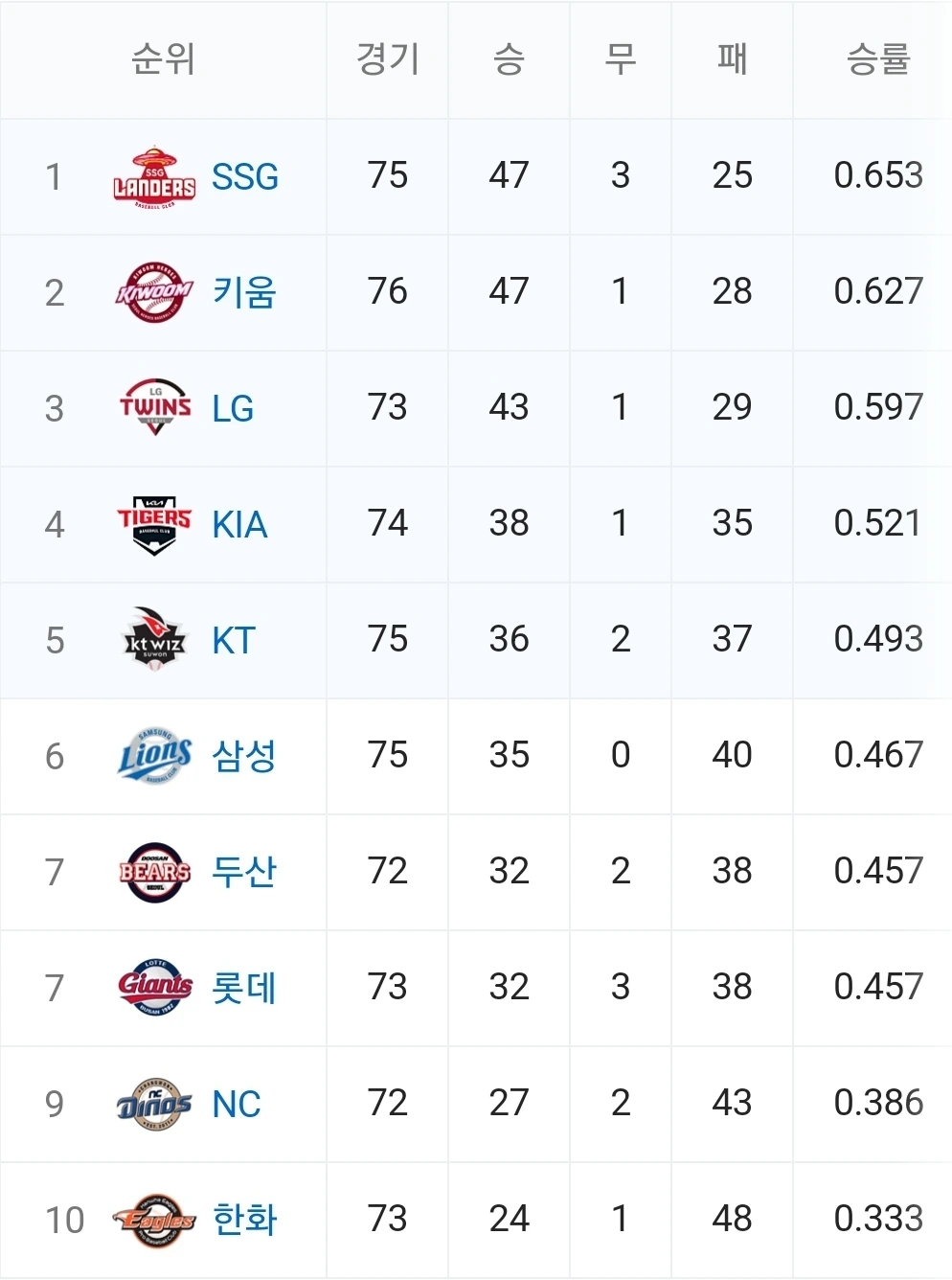 현재 KBO 리그 순위는 정말 기묘합니다. 작년에 정규시즌 1위 자리를 놓고 타이브레이커 경기를 펼쳤던 두 팀이 채 5할도 되지 않는 승률로 5위와 6위를 마크하고 있습니다. 5위인 kt wiz의 승률이 5할이 되지 않고 삼성 라이온즈는 5위와 2 게임차 6위이며 바로 아래에는 6위와 0.5 게임차의 두산 베어스와 롯데 자이언츠가 있죠. 삼성 라이온즈가 순위를 높이기 위해서는 부상 선수의 회복이 필수적이라고 생각합니다. 기존에 주전이 아니었다는 말은 다르게 말하면 1군 풀타임 선발을 치러본 적이 없다는 말이기도 합니다. 언제 힘이 빠질지 알 수 없는 상황에서 기존 주전 선수들의 복귀가 늦어진다면 현재 순위조차 유지하기 어려울지도 모릅니다. 바로 아래에 있는 팀이 기묘할 정도로 가을야구를 잘 갔던 두산 베어스인지라 순위 변동 가능성이 더 크게 느껴지네요.